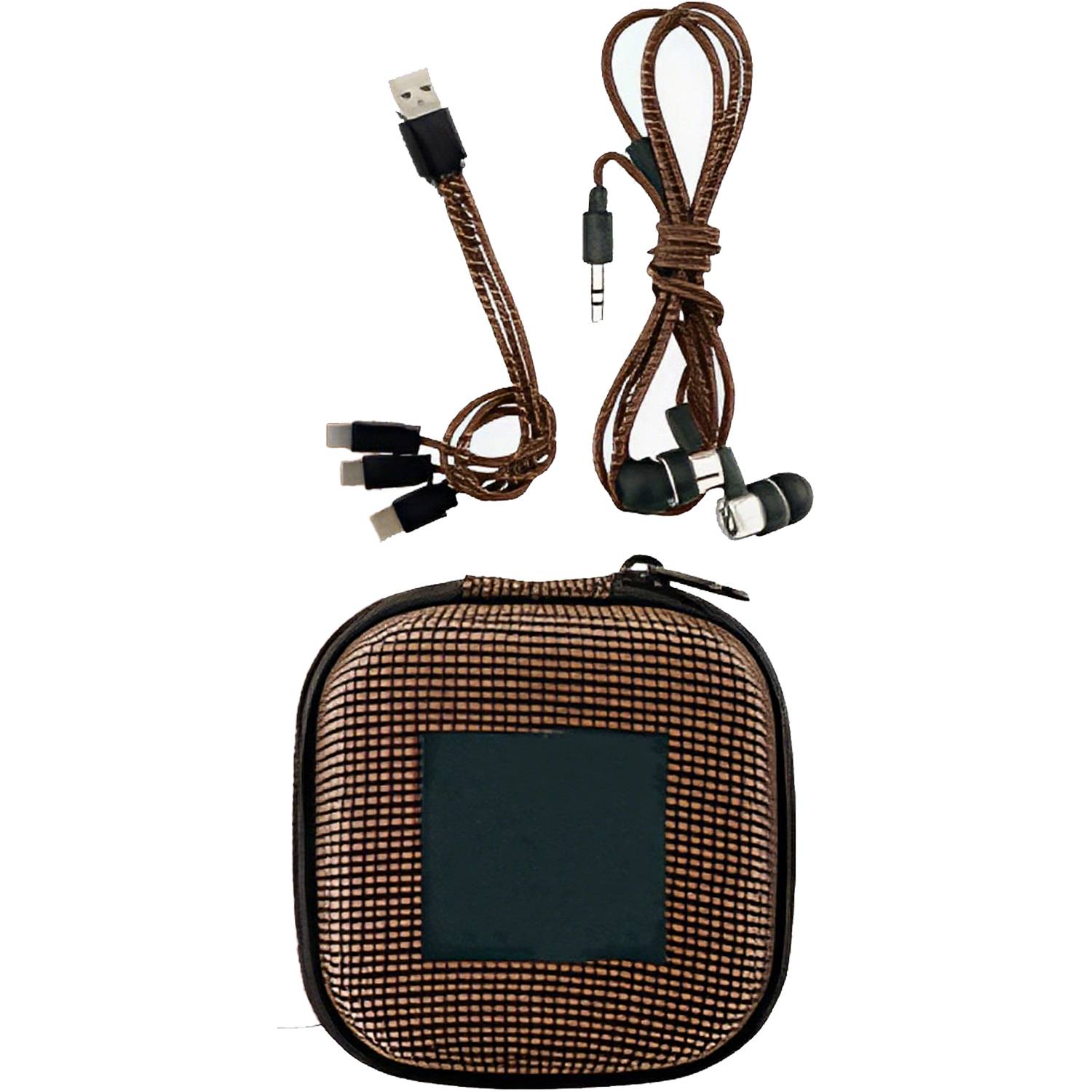Wired earbuds with 3-in-1 charging cables & compact case – audio & power solution for travel.