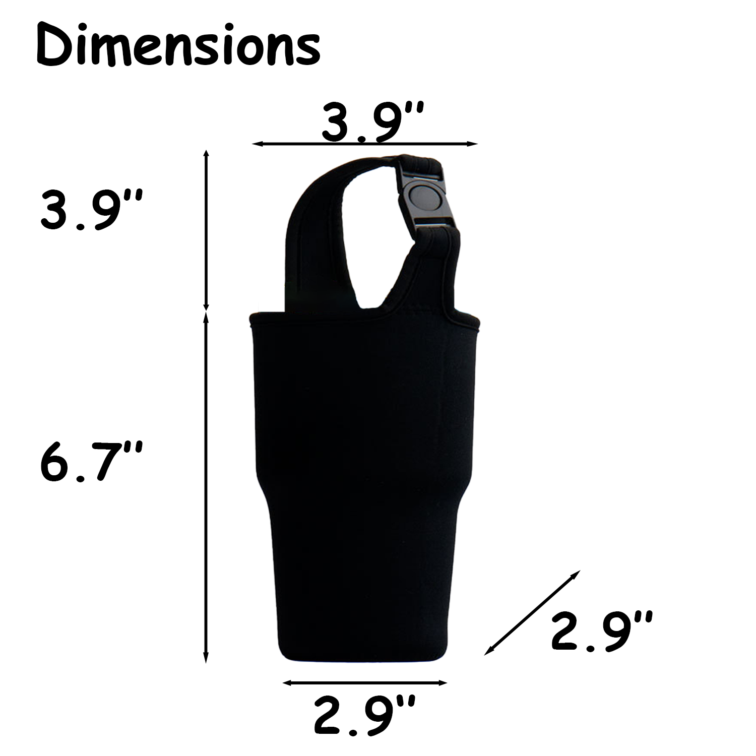 Stretchable 30 oz insulated cup sleeve with snap handle, made of durable neoprene fabric.