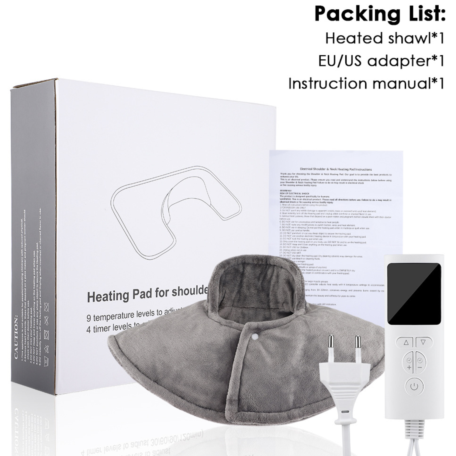 Heating pad, 9 temps, 4 timers, LCD. Ultra-soft, safe, quick-heat. Relieves pain, cozy. Home/office use, easy cleaning.