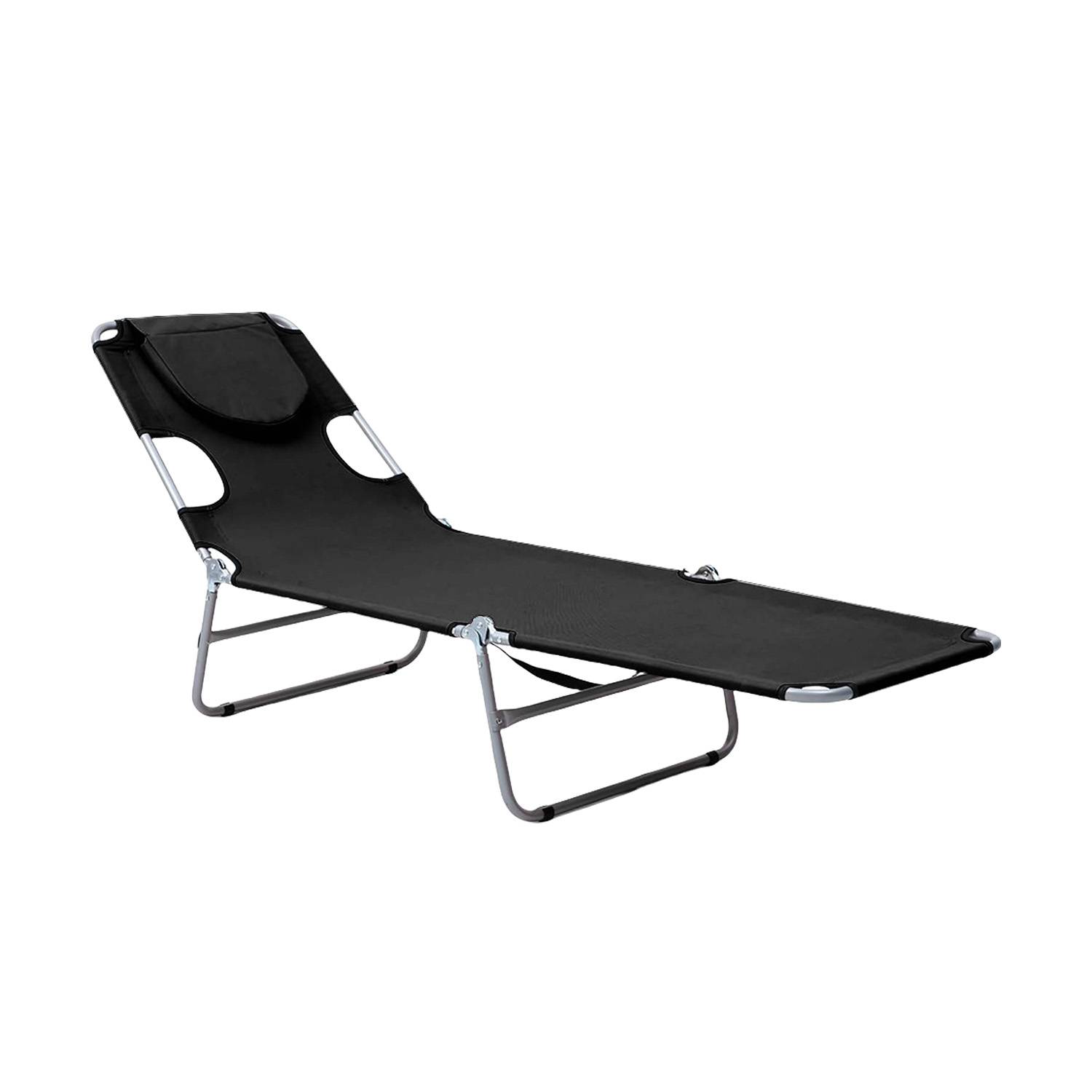 Beach lounge chair with detachable tanning pillow, cushion, portable, durable, adjustable for sunbathing relaxation.