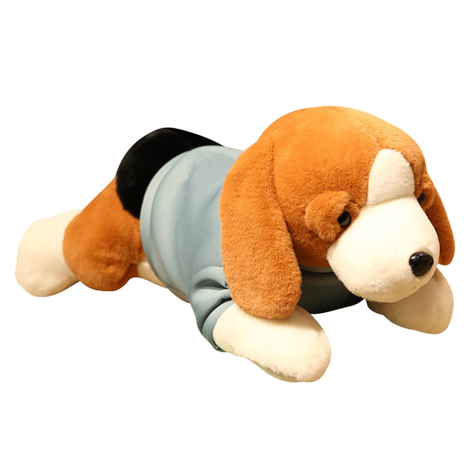 Soft plush dog toy made of Polypropylene cotton, features a washable outfit, high elasticity, non-shedding and skin-friendly.