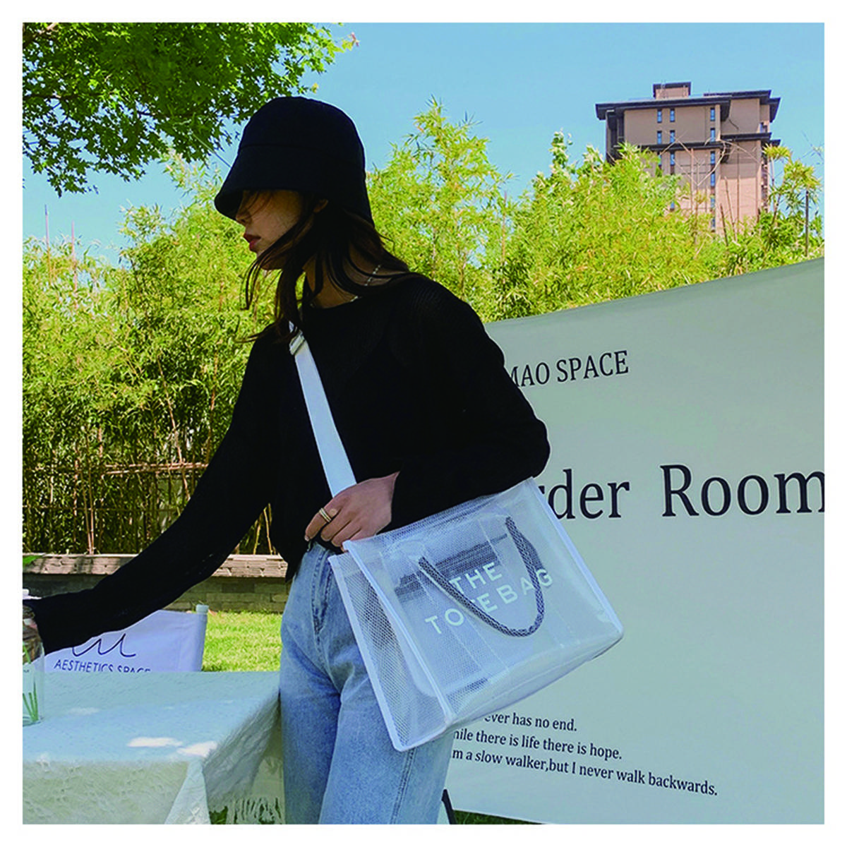 It is a PVC tote bag that is very stylish and allows you to quickly check if any items are missing.