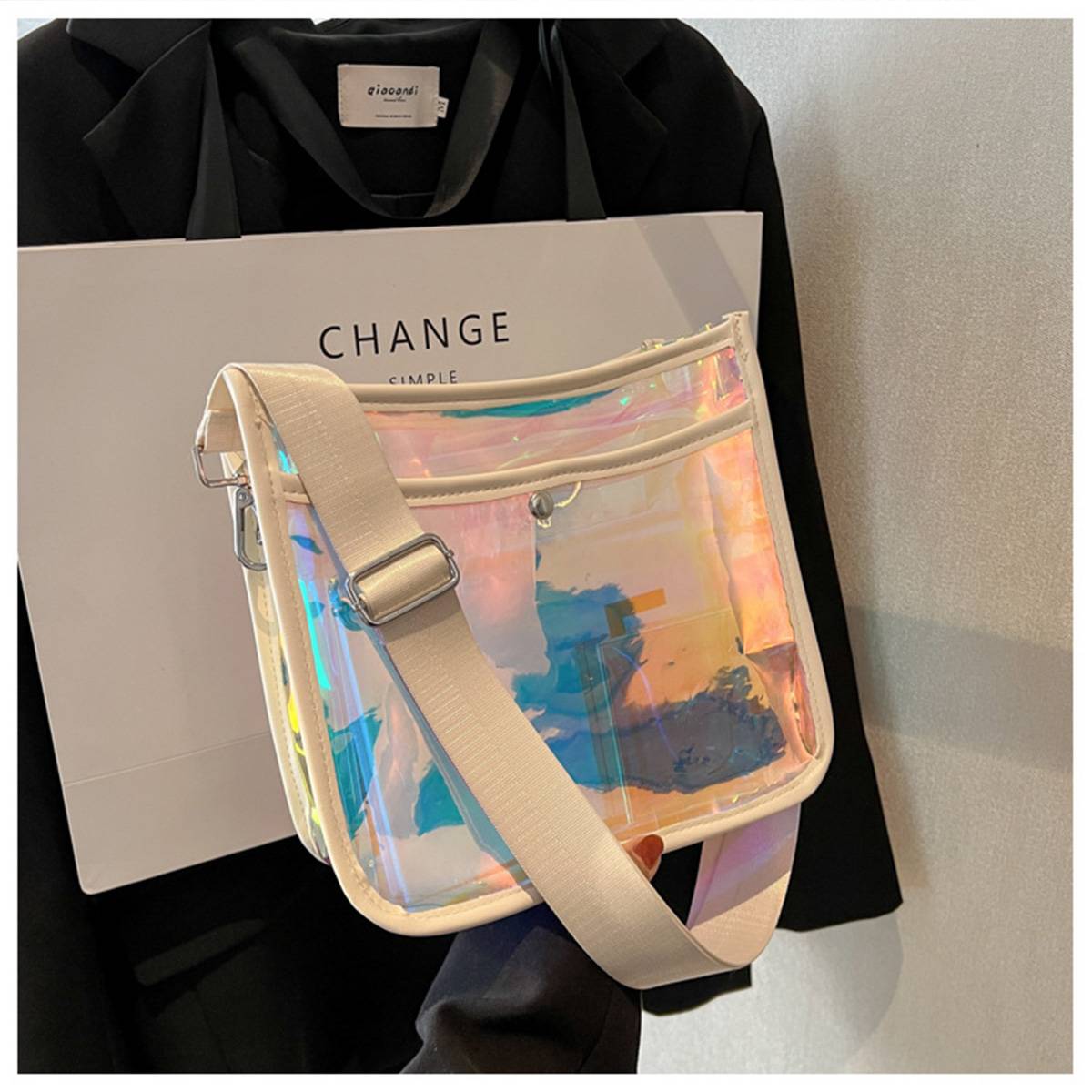 This is a dazzling laser bag made of PVC material, which is a must-have item for fashionable women.