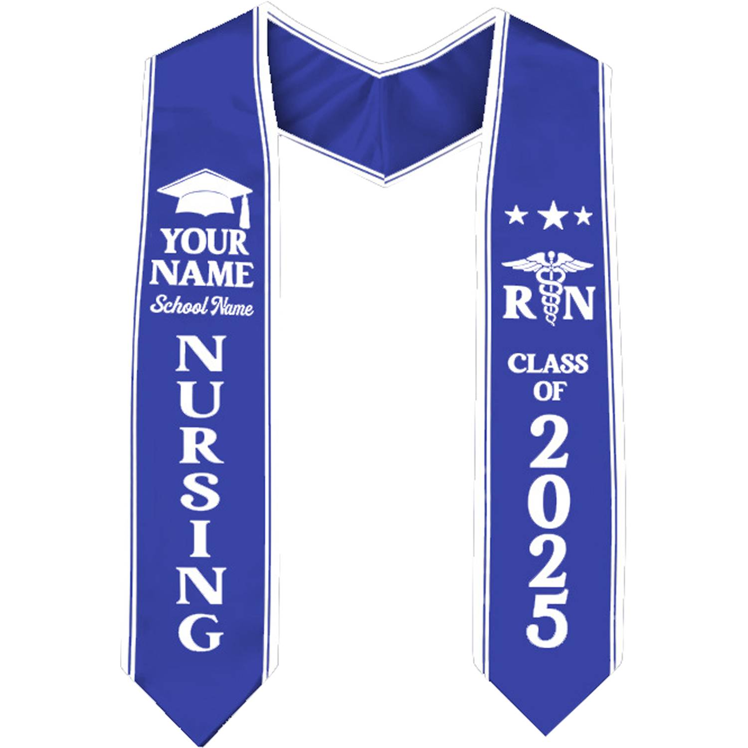 Custom satin graduation stole, personalized with name/message, durable, smooth fabric, perfect for ceremonies, lasting quality.