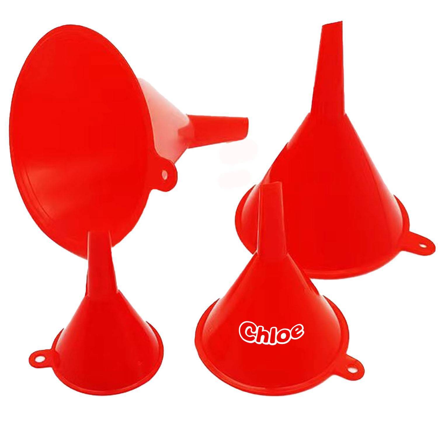 Red plastic 4-piece portable fuel funnel set: durable, food-grade, safe, non-toxic, leak-proof, easy to grip. Fits car, home use.