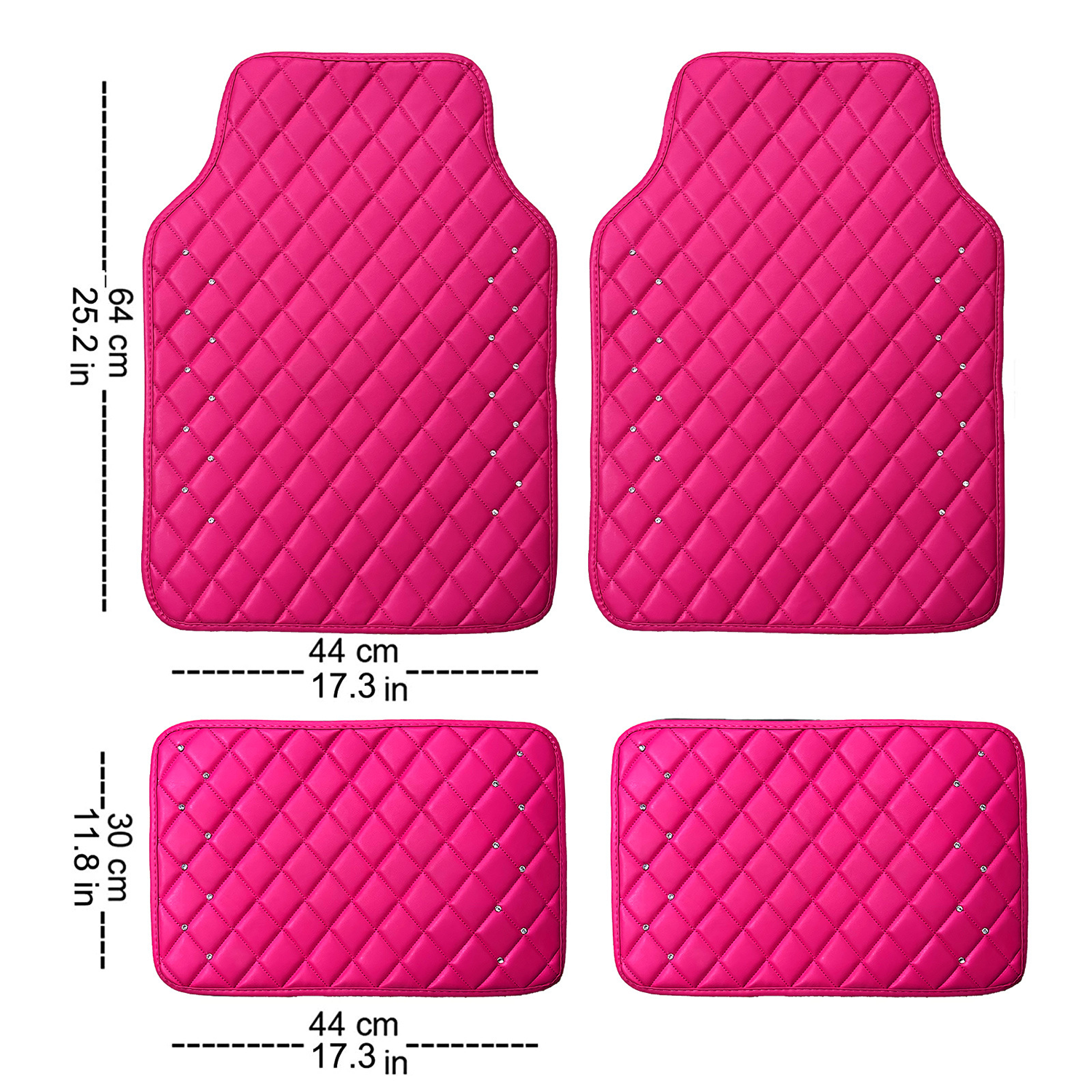 2 front, 2 rear mats for 95% cars. Non-slip. Rhinestone design. High-quality carpet. Waterproof. Easy install.