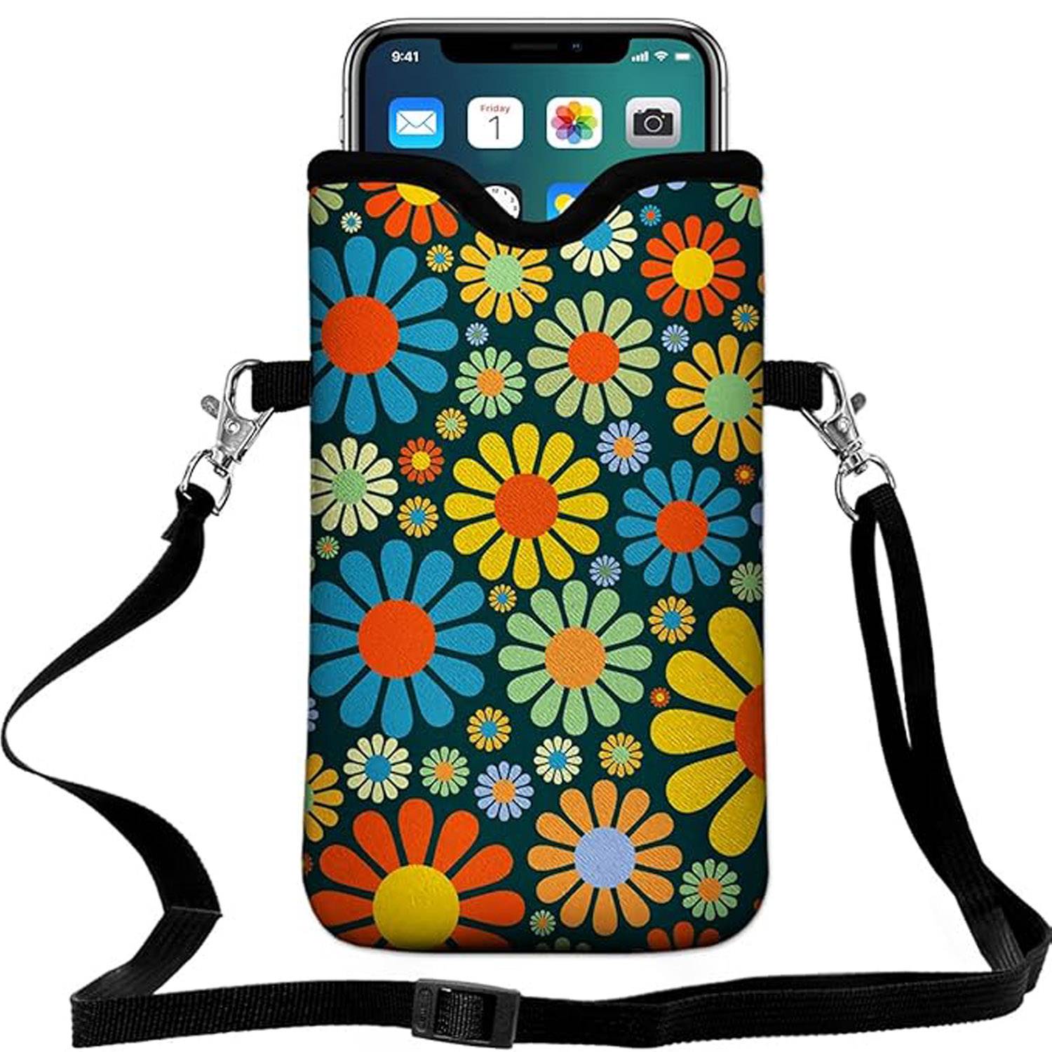 Stylish neoprene phone pouch with floral print, shockproof and water-resistant, adjustable strap for hands-free carry.
