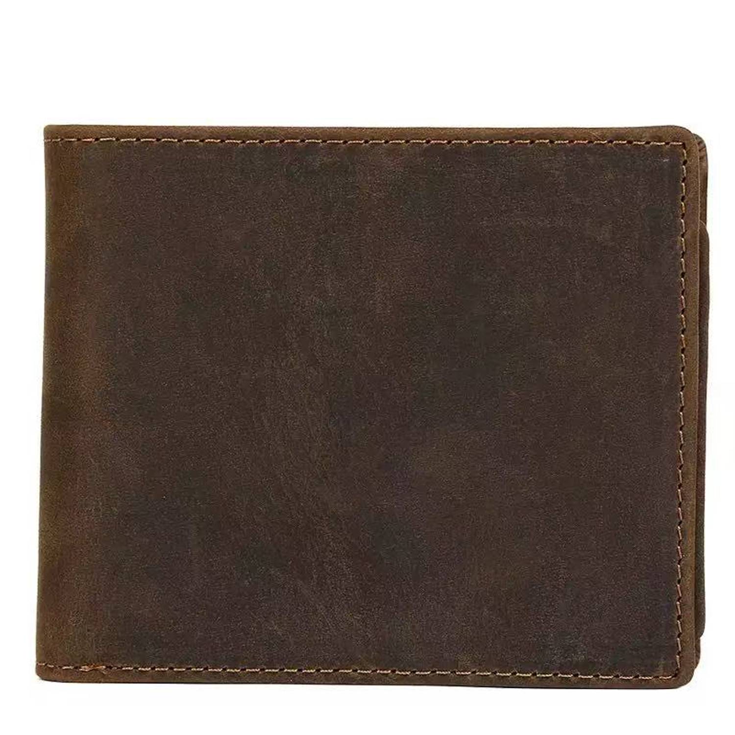 Genuine leather bifold wallet with RFID blocking, 8 card slots, 2 cash slots, double-stitched, durable design.