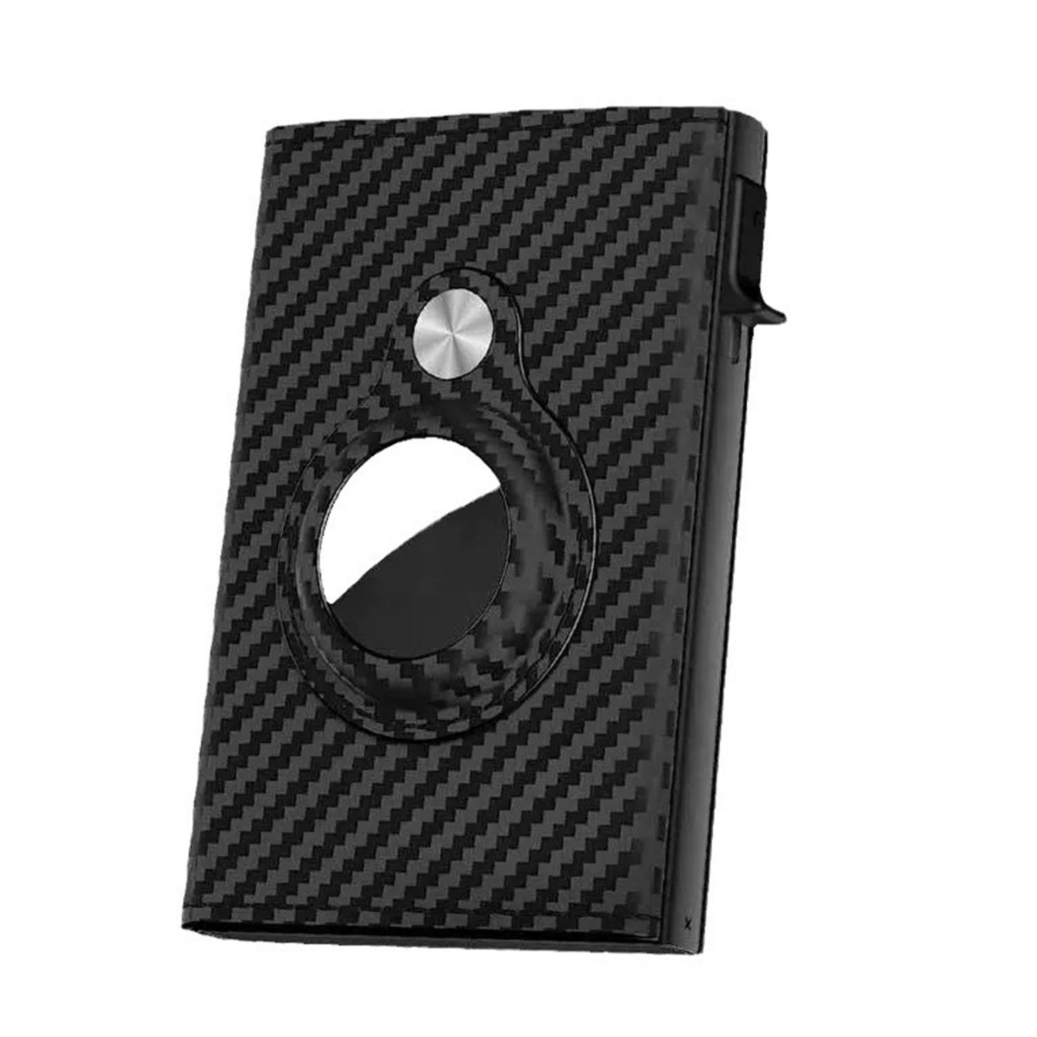 Carbon fiber trifold wallet with RFID protection, tracker slot, slim design, and smart storage.