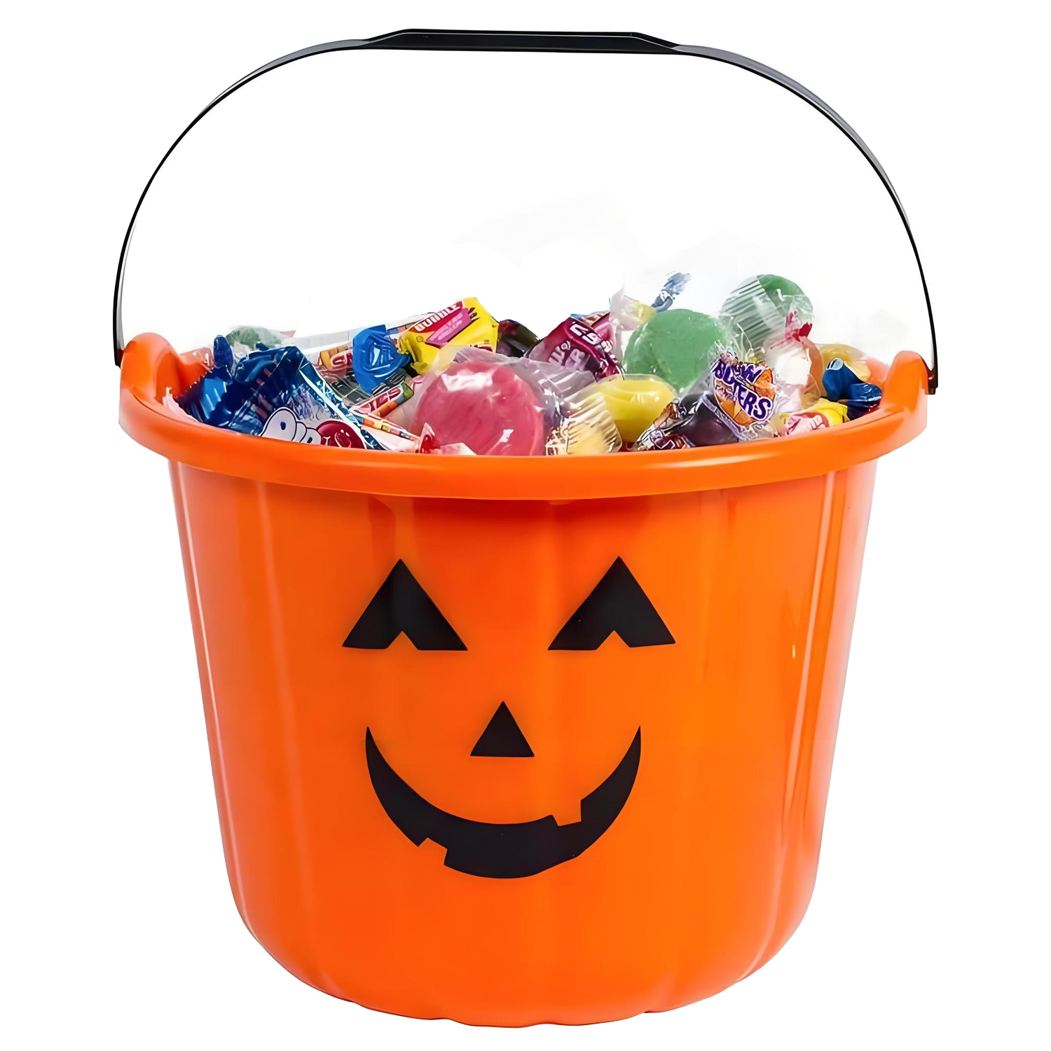 Classic pumpkin-shaped plastic bucket for Halloween candy collection and festive decoration. Lightweight with sturdy handle.
