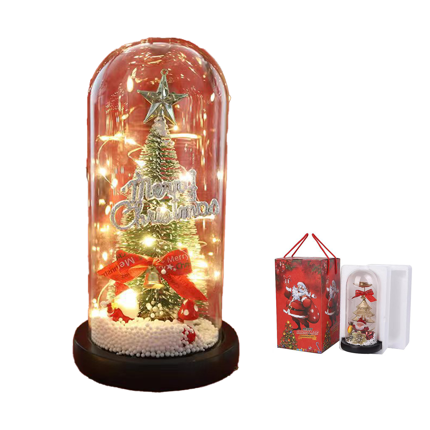 New mini artificial Christmas tree in transparent glass dome, euipped with RGB string lights, santa claus and bell component.