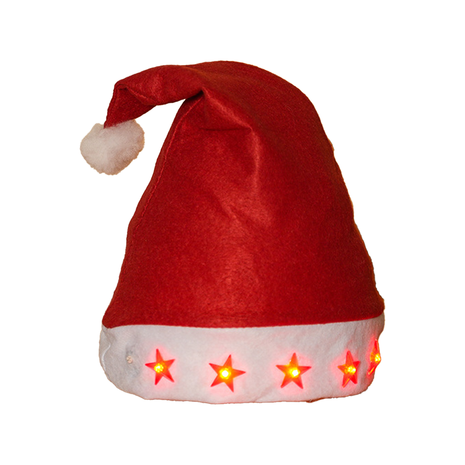 Non woven Santa hat with LED star lights, soft brim, and pom-pom. Fun, safe, and festive for Christmas parties and celebrations.