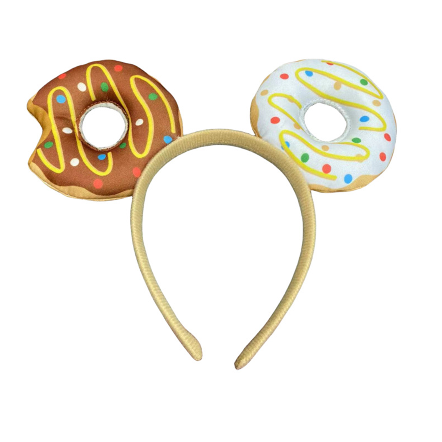 Fabric donut headband w/ sprinkles. Stretch fit secure wear. Party costume accessory for events.