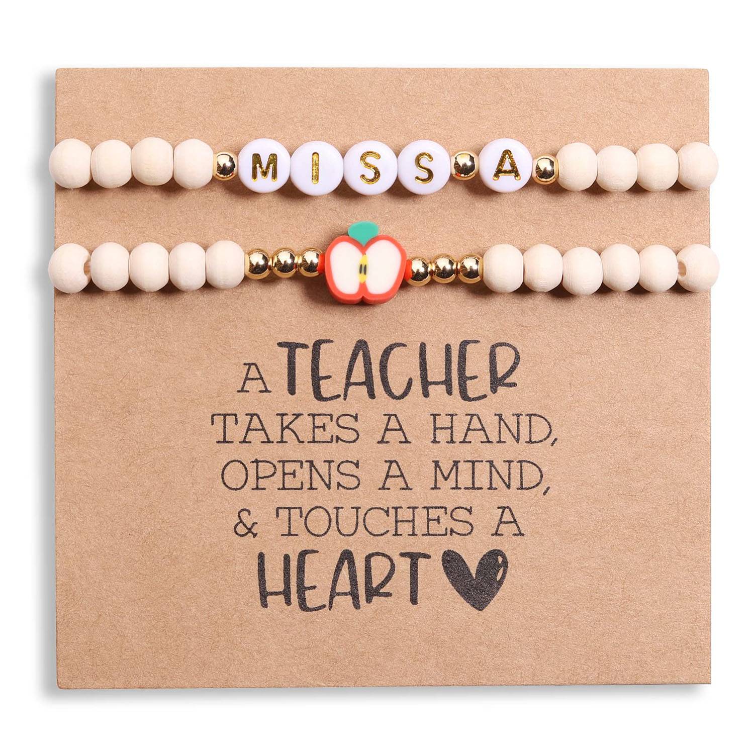 Handmade teacher bracelets made of wood and soft clay, hypoallergenic, stretchy, customizable, ideal for gifts, and celebrations.