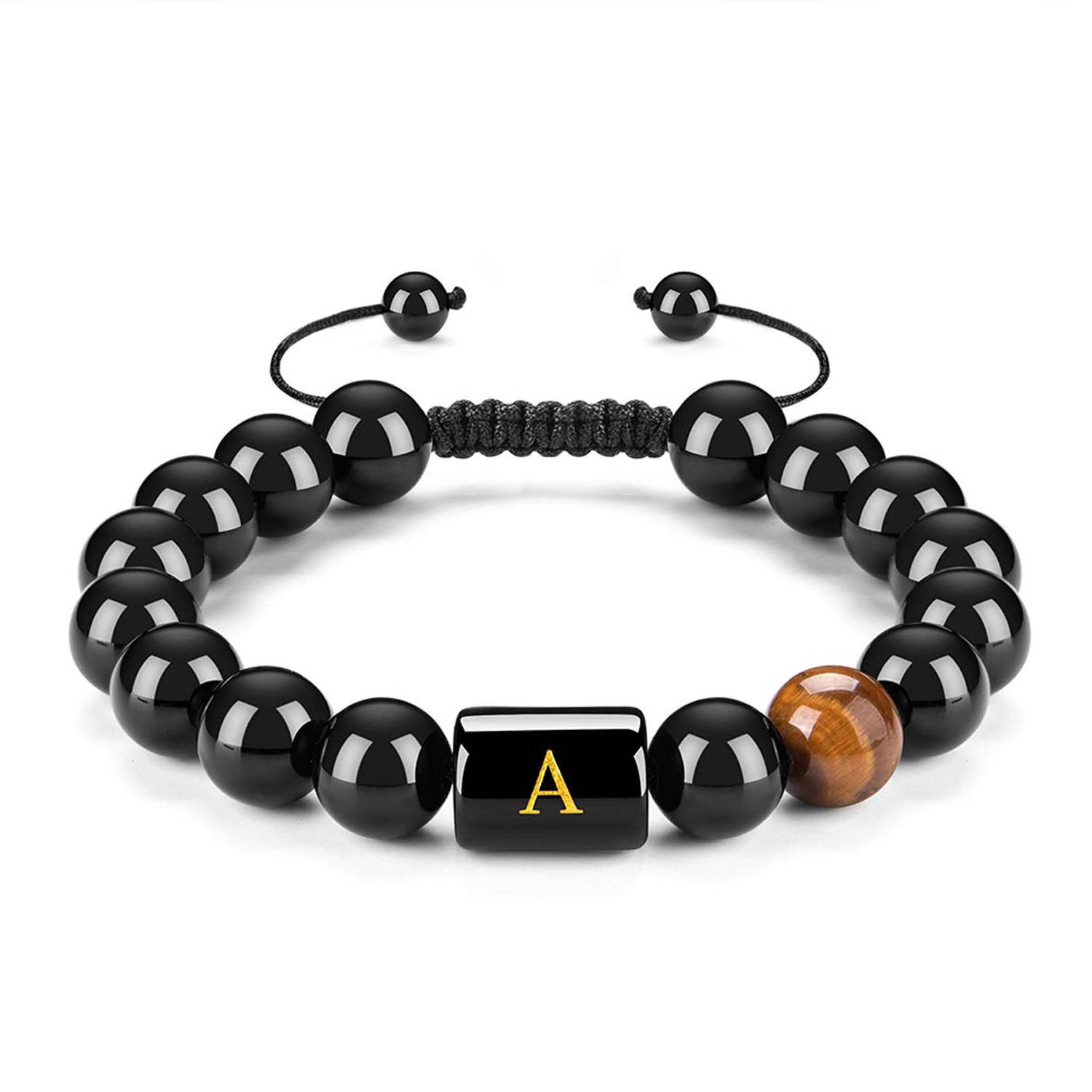 Black agate men’s bracelet, hypoallergenic, stress-relief, customizable letters, lightweight, perfect for daily wear or gifting.
