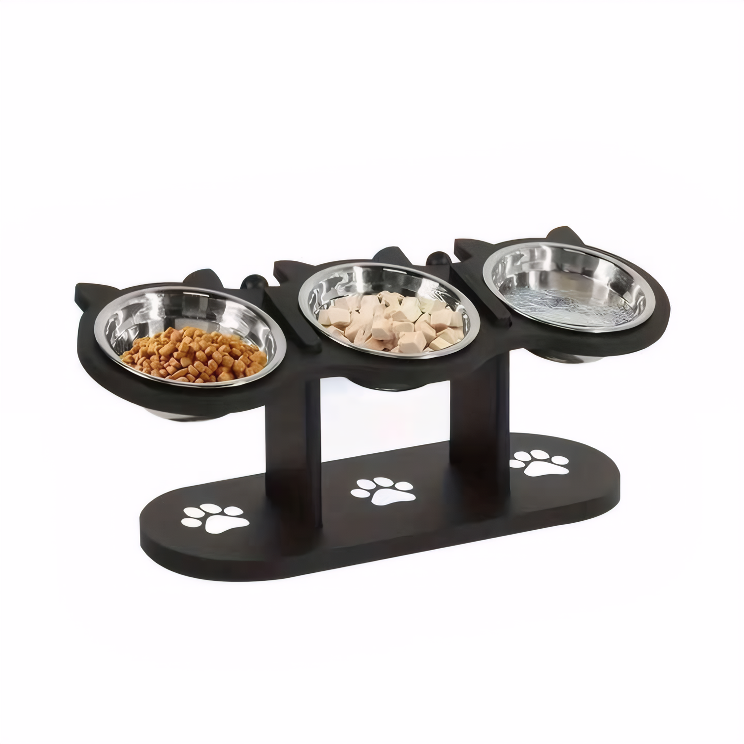 Adjustable Wooden Pet Feeder Stand with 3 Stainless Bowls