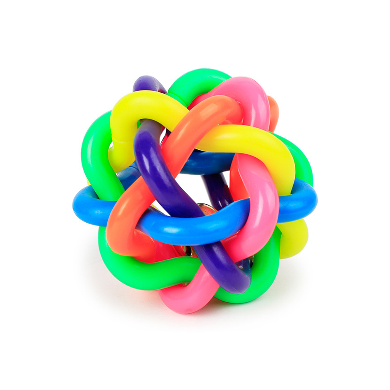 Colorful rubber dog ball with built-in bell, soft texture, safe for chewing, ideal for playful pups and interactive pet fun.
