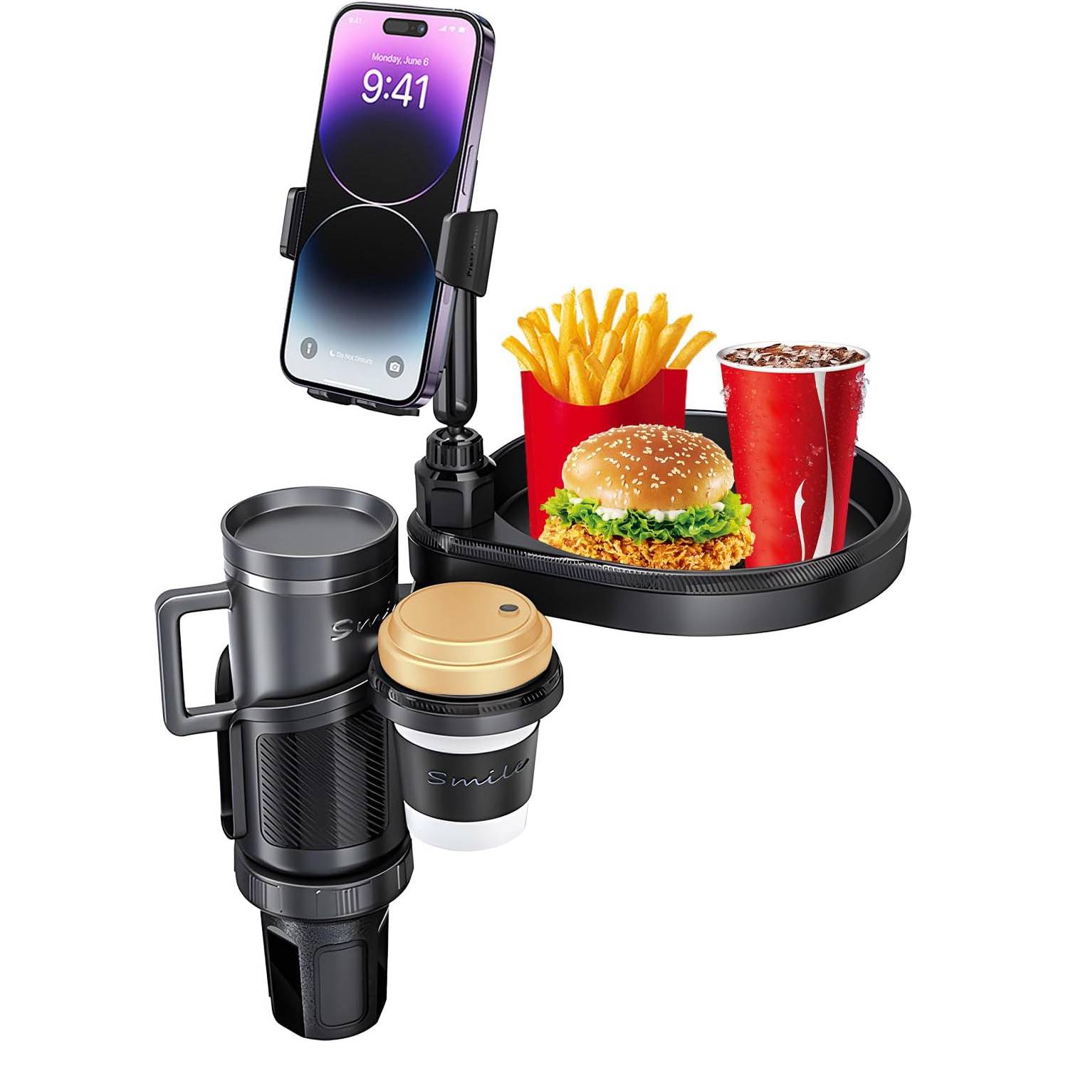 This car cup holder tray integrates beverage storage, mobile phone storage, snack storage, and seat tray functions,