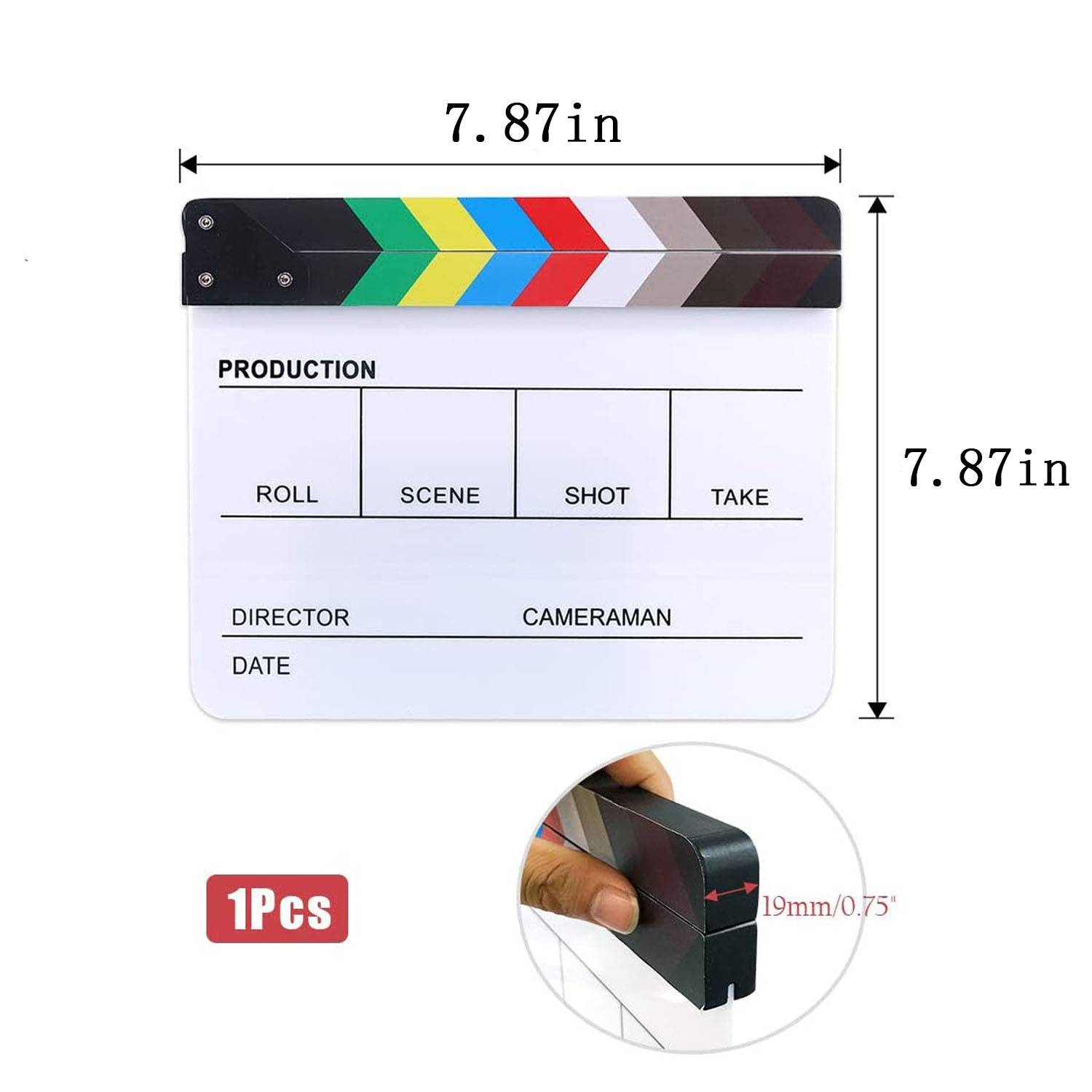 Cut Action Scene Clapper Board (7.9×7.9 in) for filmmakers, durable with clear writing areas for scenes.