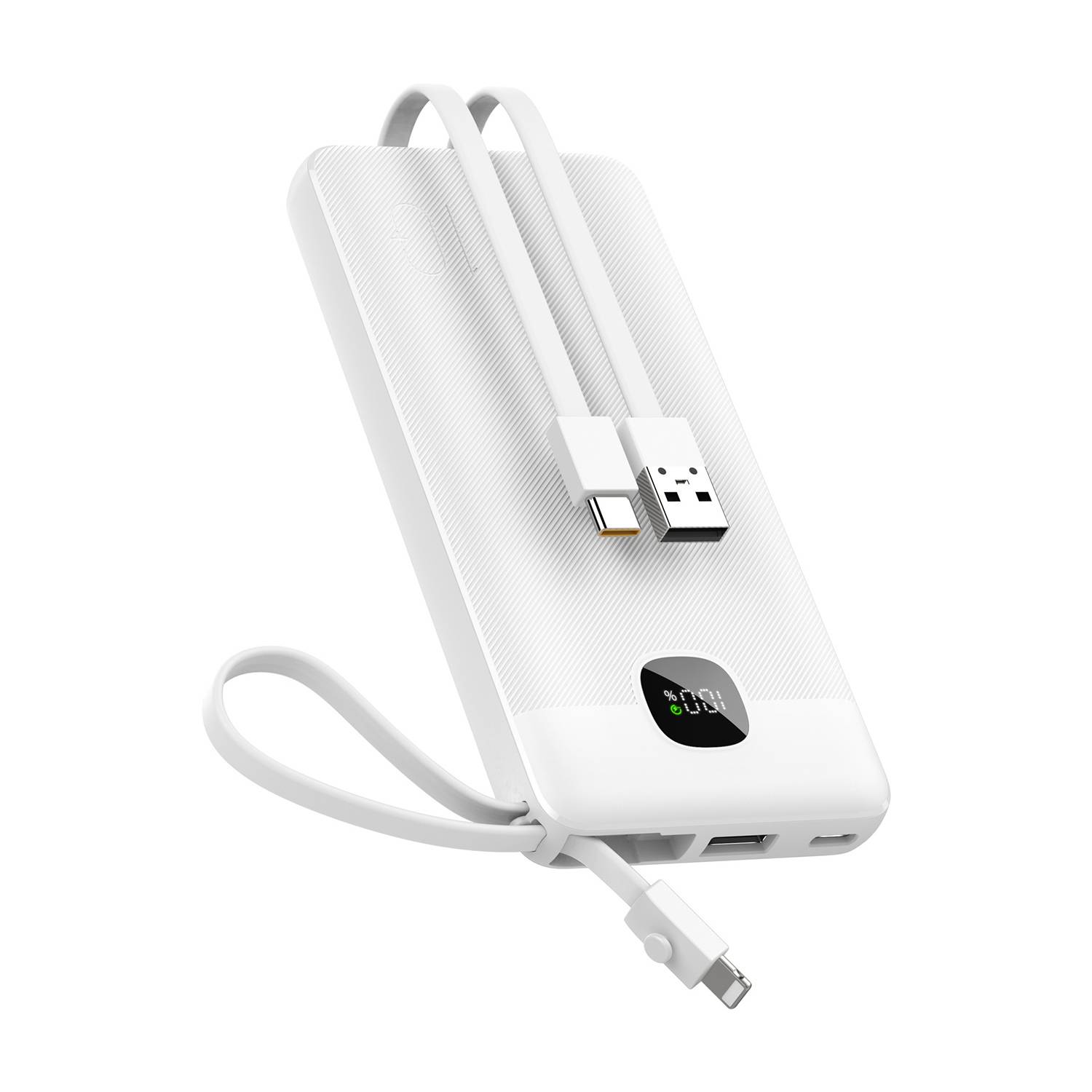 This 10000mAh power bank with built-in cable offers fast, safe, and portable charging for on-the-go convenience.