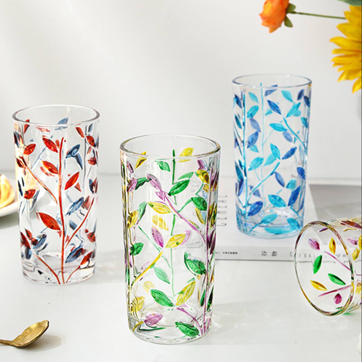 Crafted from sturdy soda-lime glass, this 11oz cup showcases elegant painted leaf accents, smooth lines, and a clear, refined texture that feels comfortable to hold. The rounded, carefully polished rim protects your lips, while the thick, weighty base adds stability and everyday safety. Perfect for hot tea, chilled juice, or table decor, it brings a relaxed, natural charm to any setting. Its generous capacity suits daily hydration, quiet breaks, and gatherings.