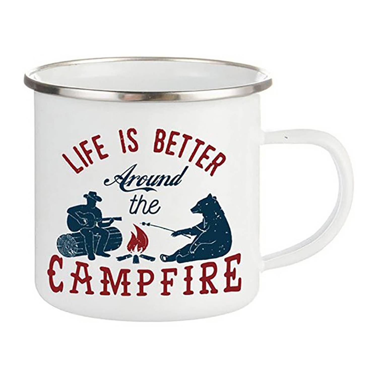 Durable 13oz enamel mug with stainless steel rim, customizable design, perfect for home, camping, and travel. Hand wash only.