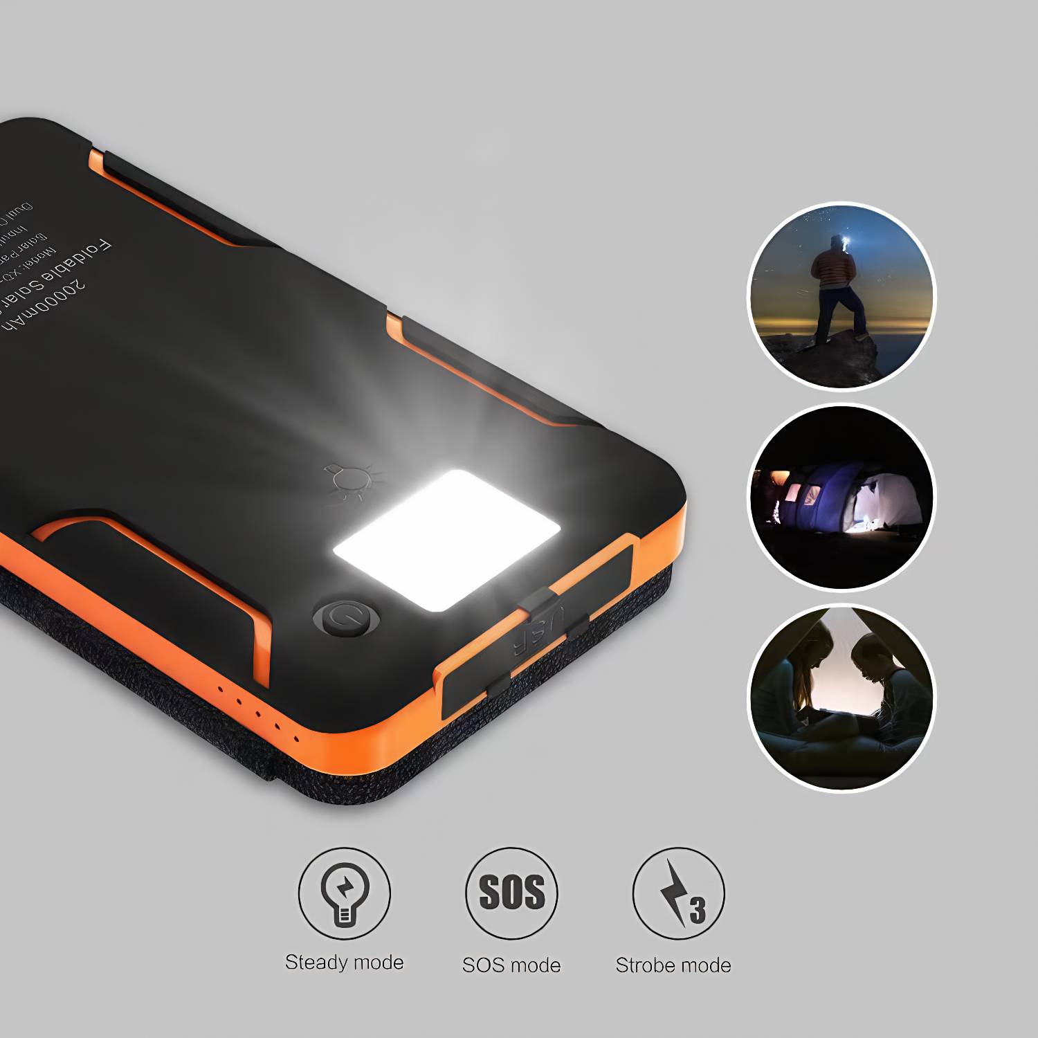 Foldable 20000mAh solar power bank with flashlight, ideal for outdoor adventures, travel, and emergency charging needs.