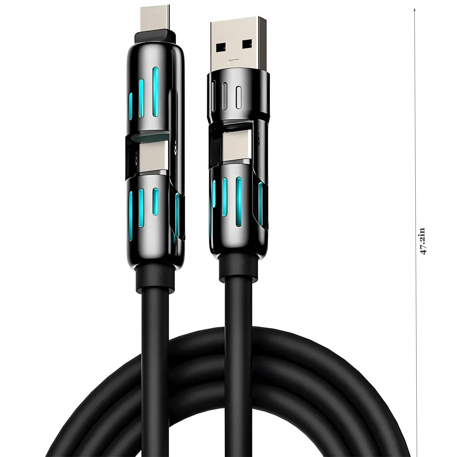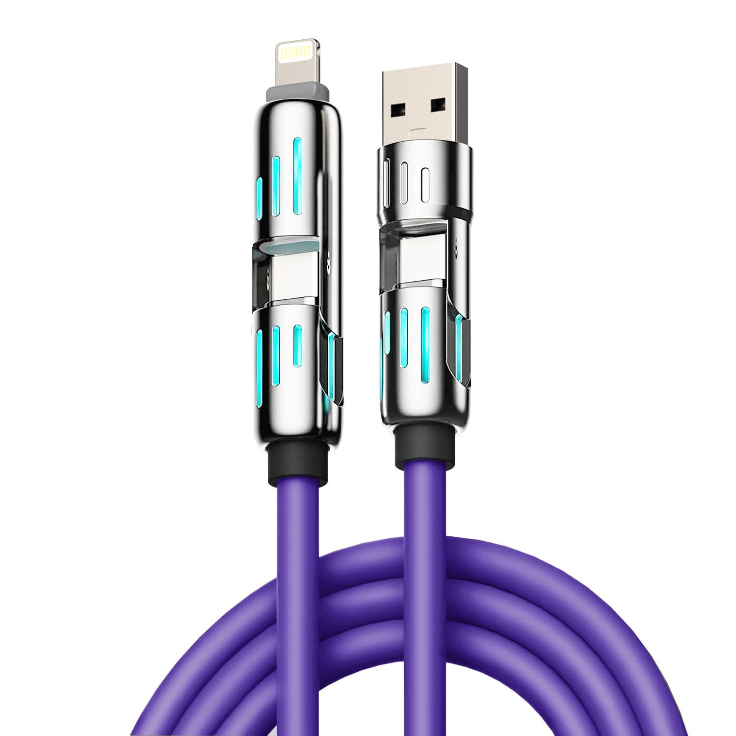 Crafted from durable TPE, this 240W 4-in-1 fast charging cable delivers powerful, efficient charging for multiple devices simultaneously. The built-in LED light creates a flowing effect, making it easy to locate in the dark while adding a stylish touch. Its compact, tangle-free design ensures hassle-free storage and portability. Safe, stable, and built to last—ideal for home, office, travel, or car charging needs.