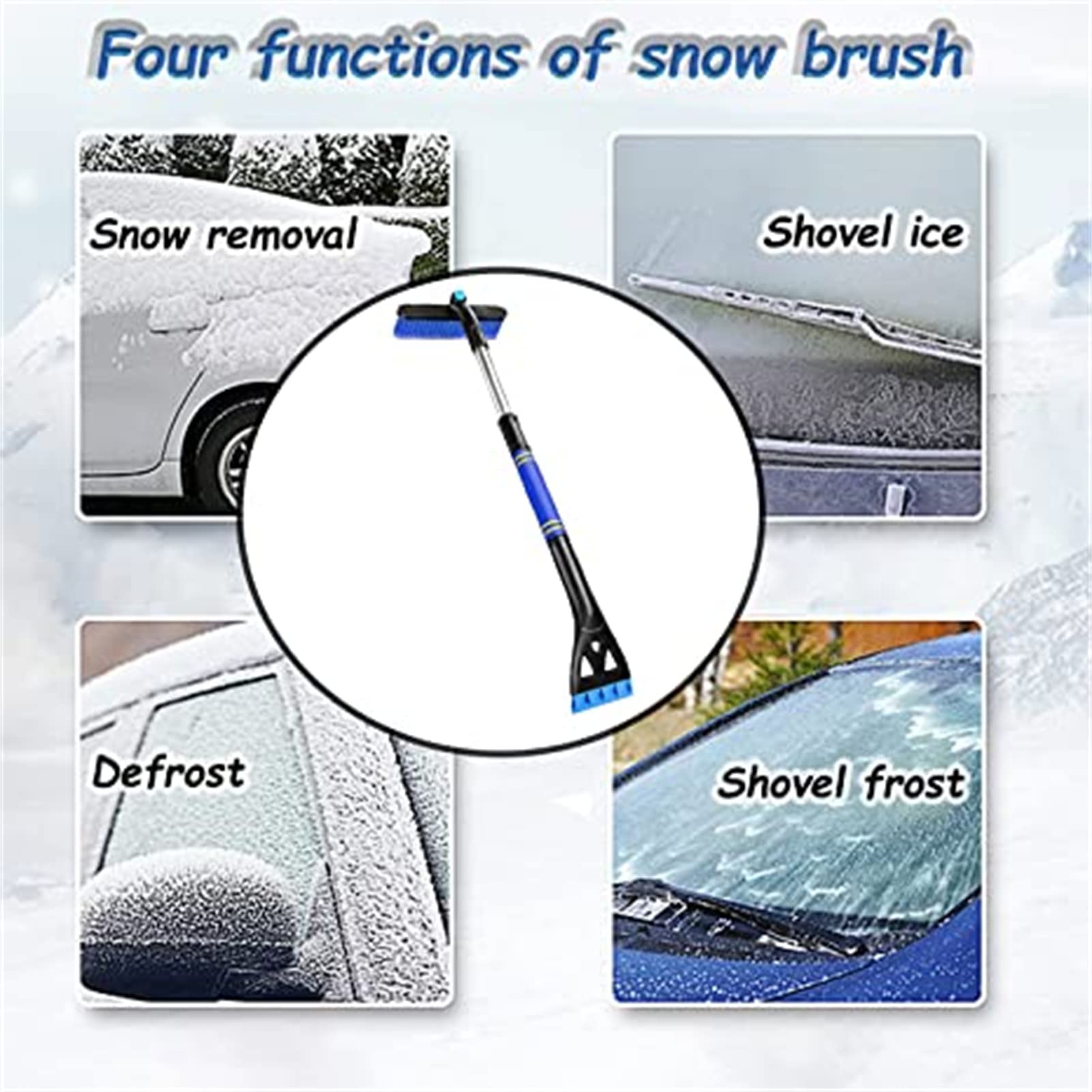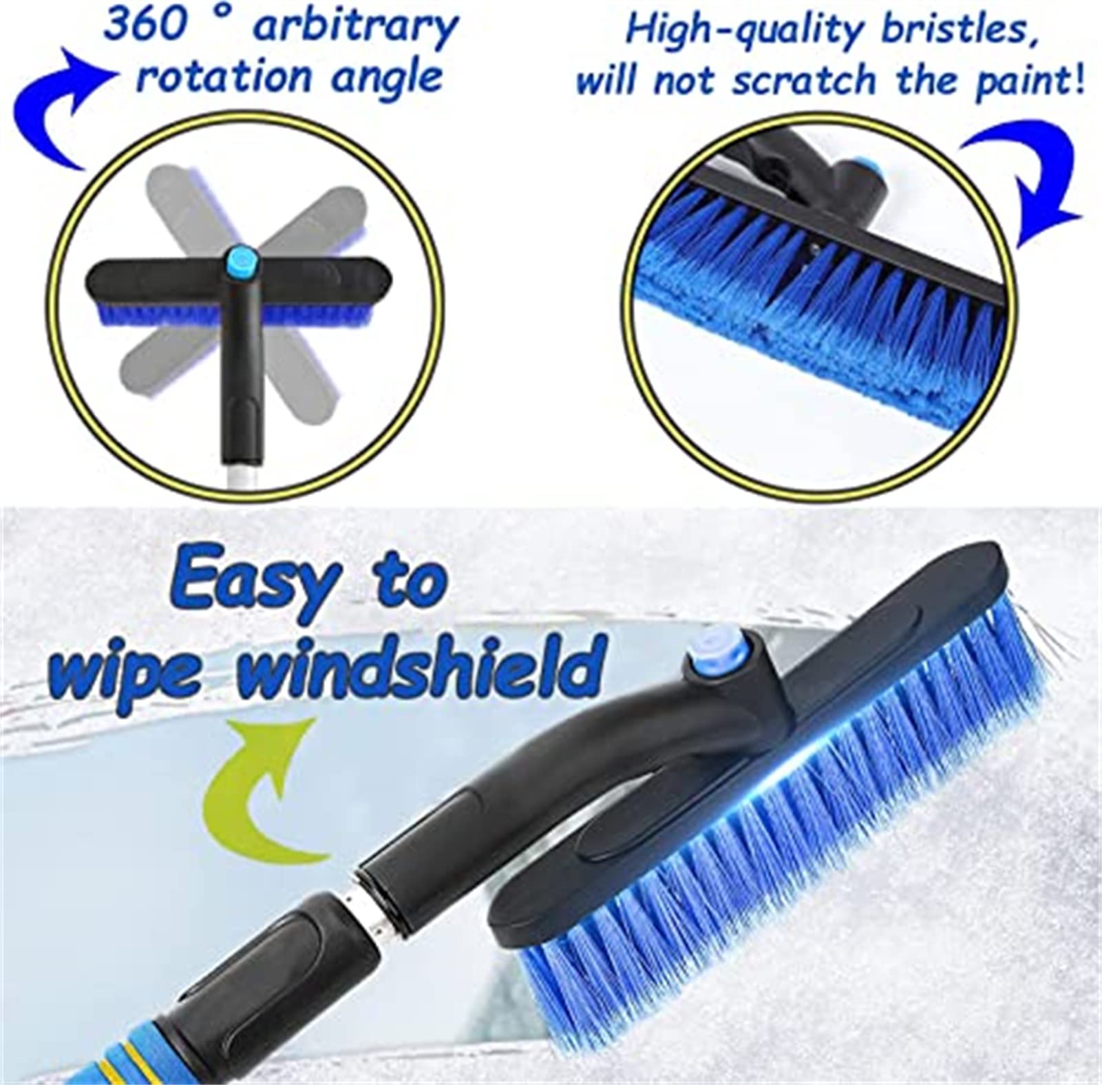 It can be divided into three parts: ice scraper,snow brush with jaws and extendable handle. The ice scraper with jaws can break and shovel the thicker ice surface, and the high-quality materials of snow scraper will not scratch the glass and car paint. The brush head is designed to rotate 360°so as to be suitable for sweeping snow in all corners. Extendable 25.5” to 31.4” space, this ice scrapers for car windshield is suitable for various vehicles.