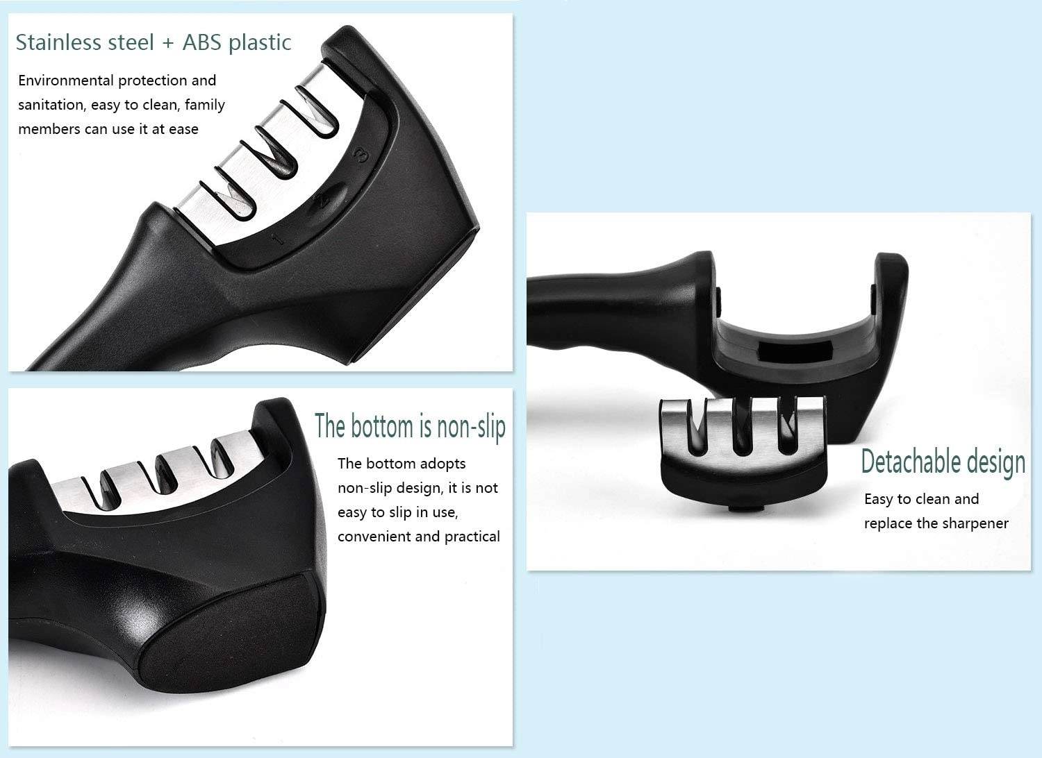 3-Stage knife sharpener helps repair, restore and polish blades with one cut-resistant glove. The best knife sharpener designed 3-slot system helps to restore & polish your kitchen knives. Simply place the blade in each of the slots and gently pull the knife through a few times for fast, effective sharpening. The ergonomic handle is easy to handle and comfortable, and the non-slip base keeps the knife sharpener not slip on the counter top.