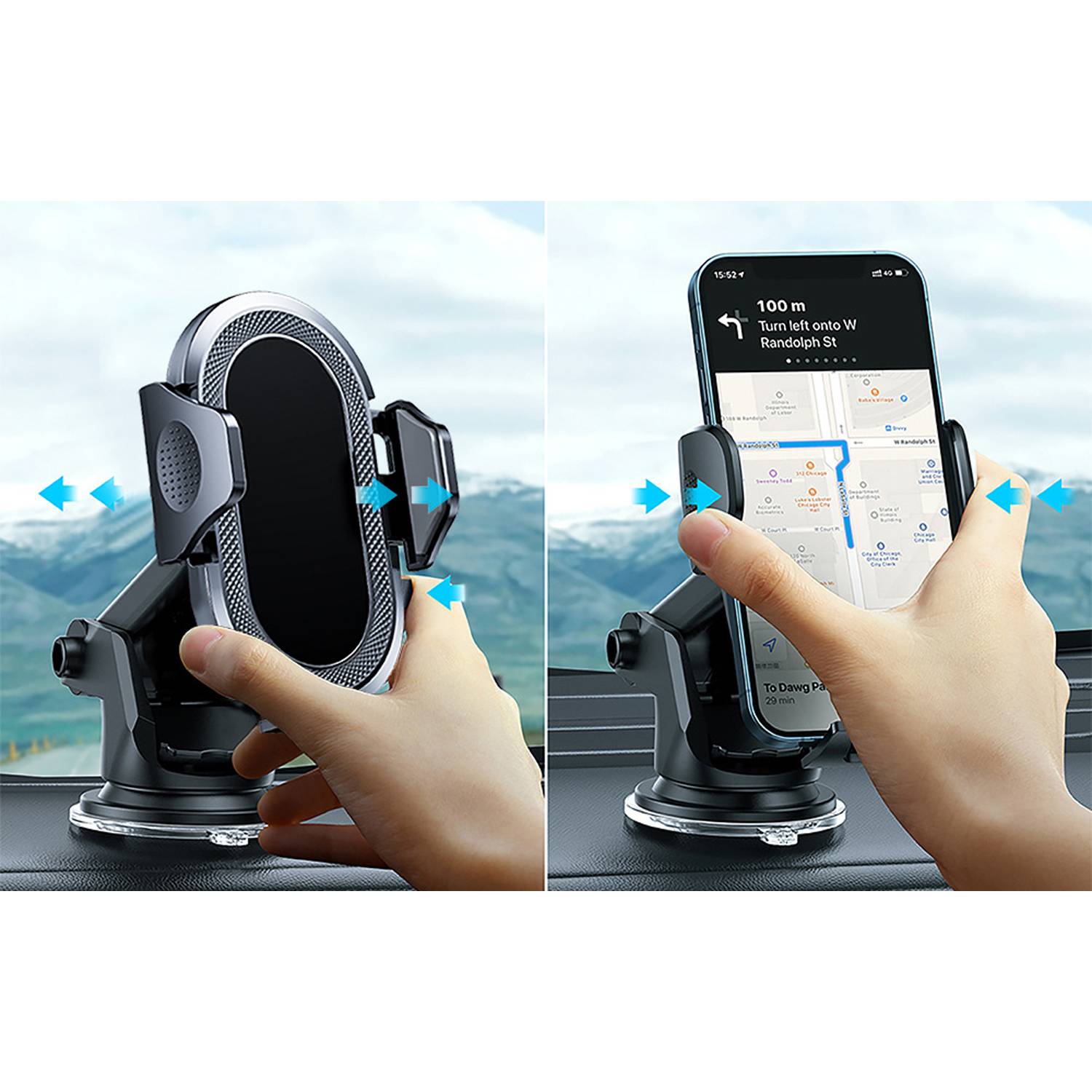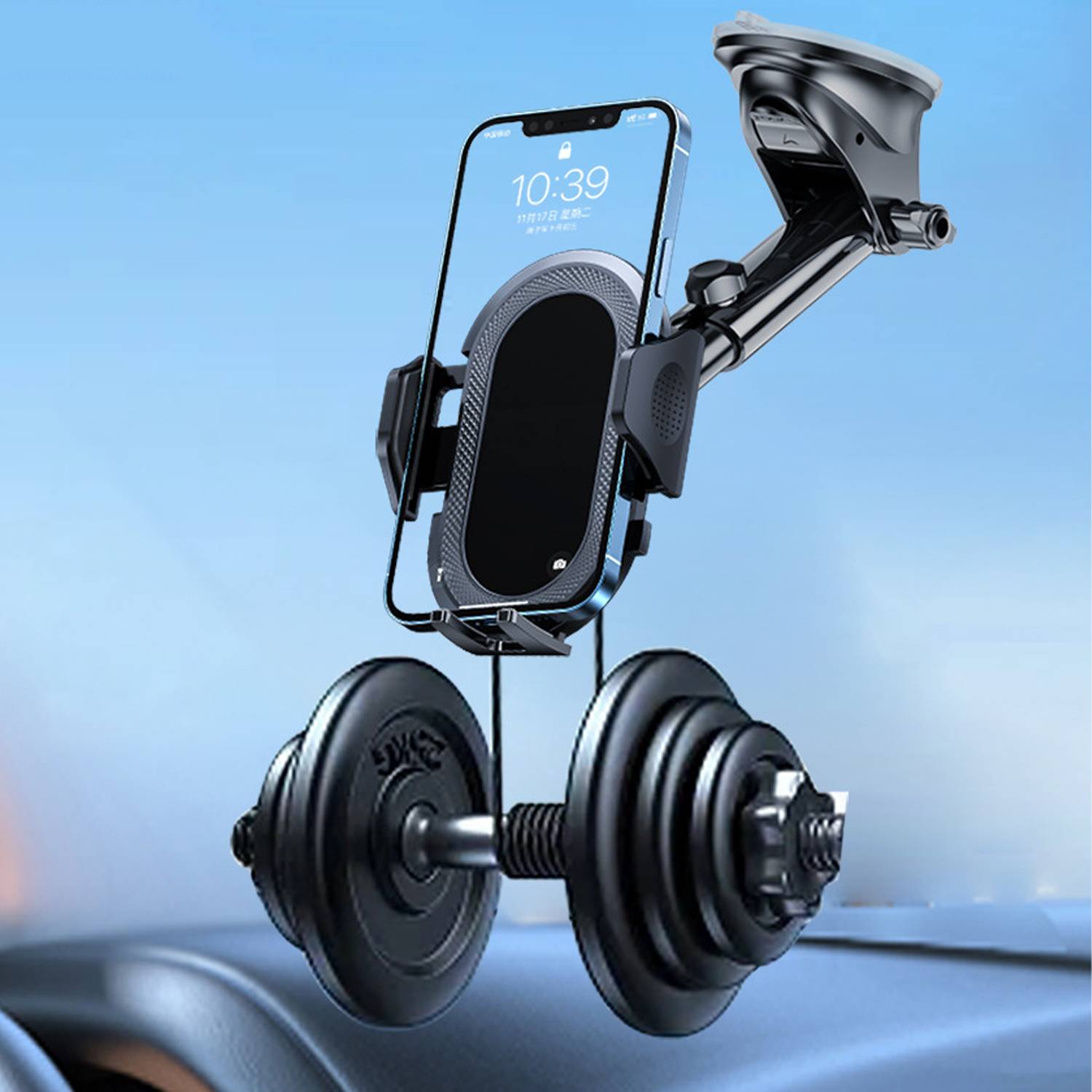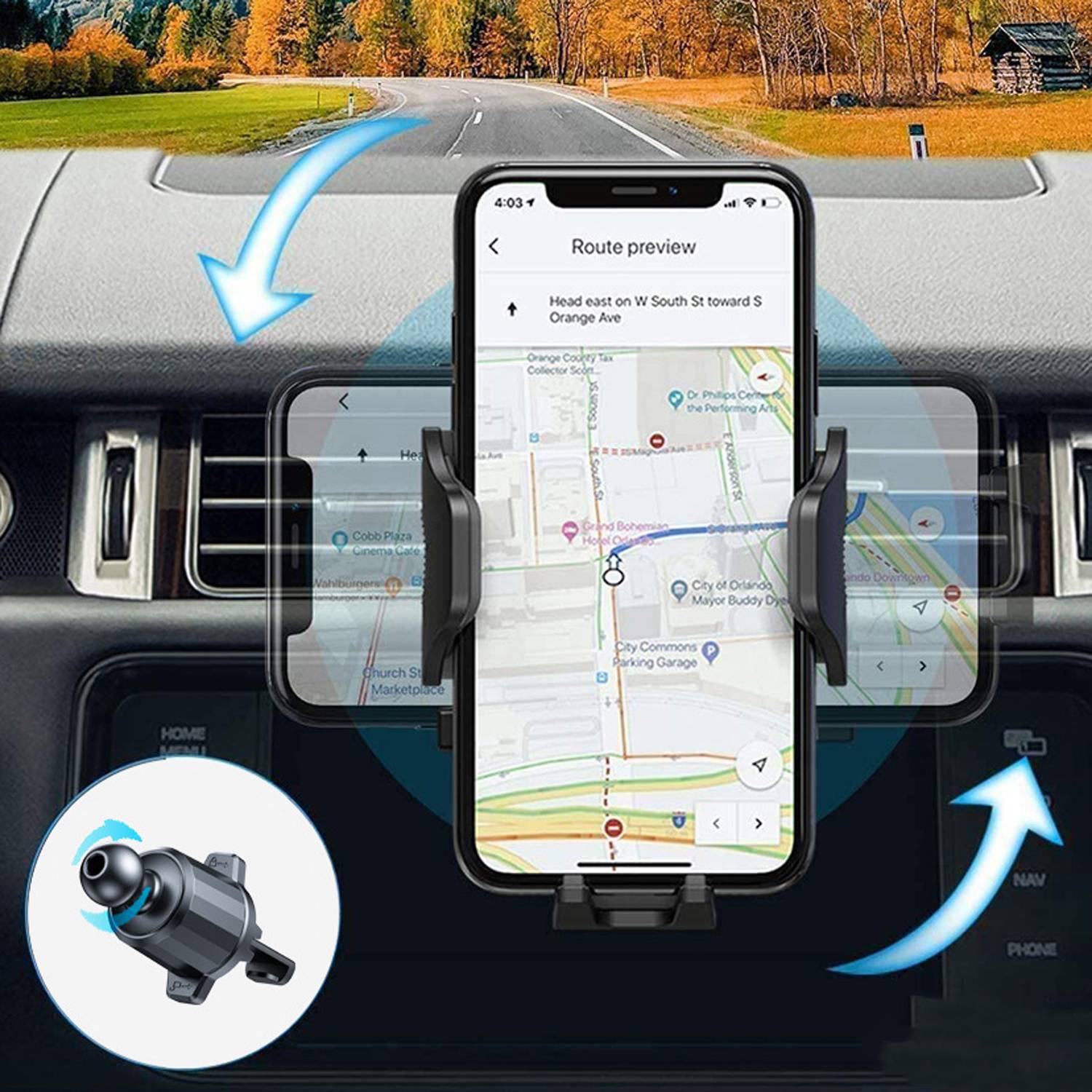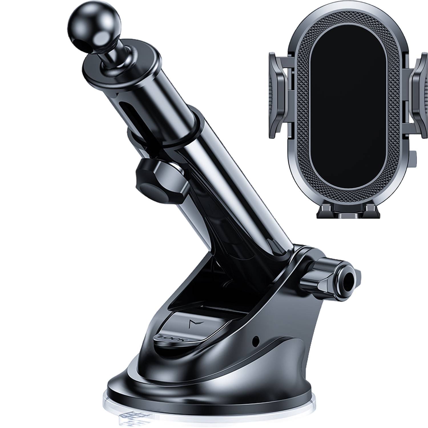 360 degree adjustable car phone holder. Secure suction cup mount for hands-free navigation, calls, and streaming while driving.