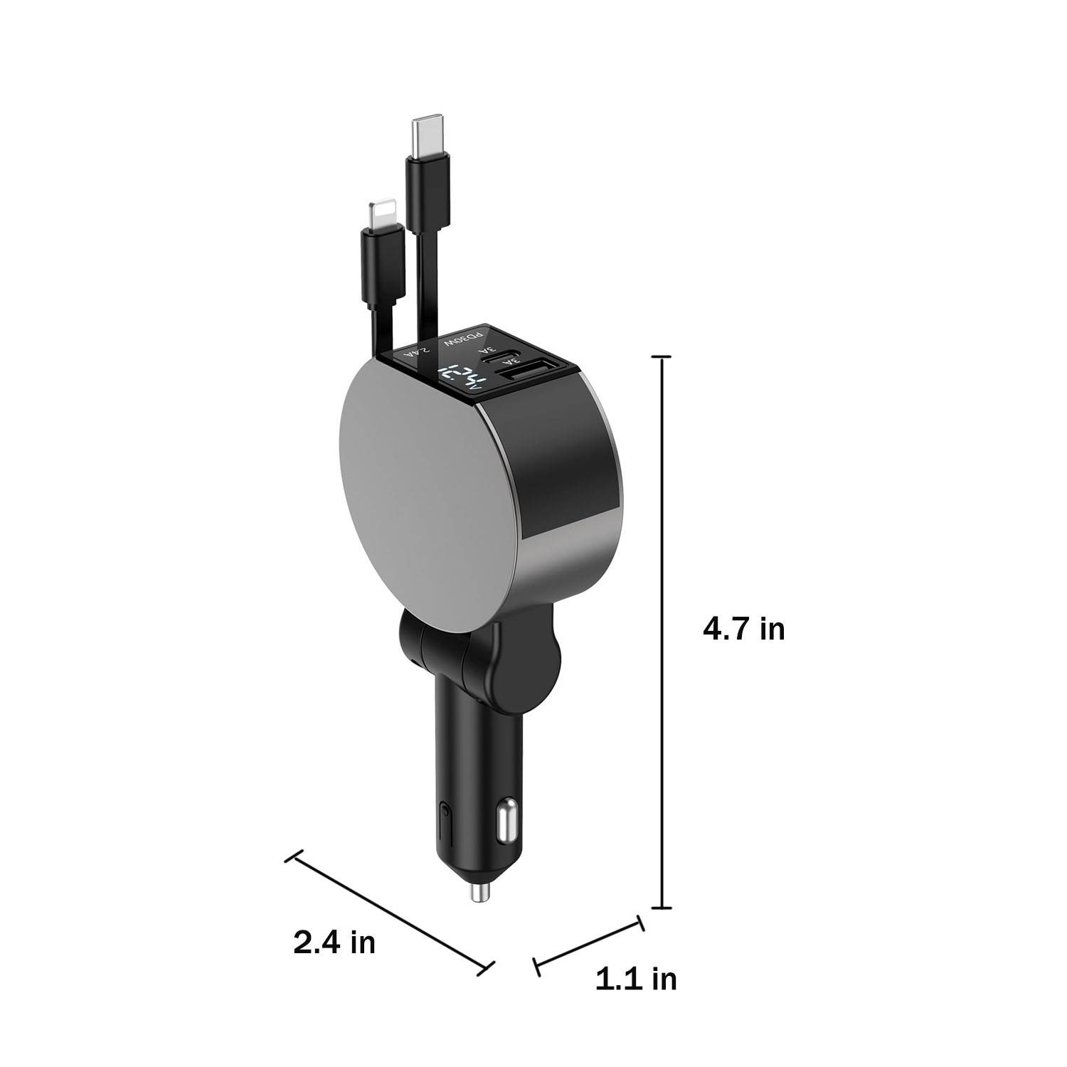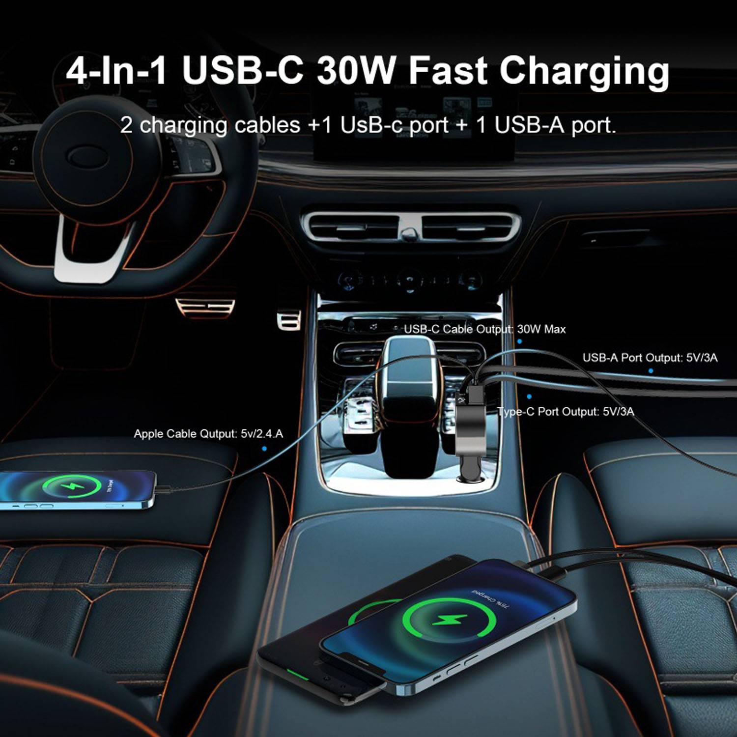 Compact retractable car charger with 4 ports, fast charging, durable ABS body, 180 rotatable plug,ideal for travel and daily use.