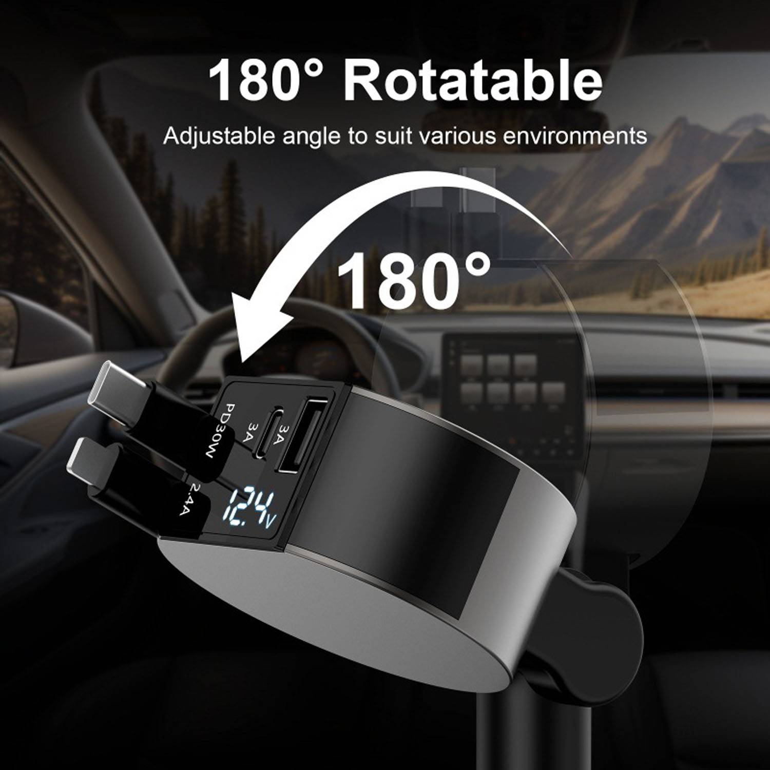 This retractable car charger features a compact, space-saving design compatible with 98% of small vehicles. Equipped with four ports—USB-C, Lightning, USB-A, and USBC—it charges up to four devices simultaneously. The Type-C delivers 30W fast charging, while the Lightning port supports PD18W. A 180 degrees adjustable plug ensures easy access in any vehicle. Made from durable ABS, it’s ideal for daily drives, business trips, and family travel. Safe, reliable, and convenient on the road.