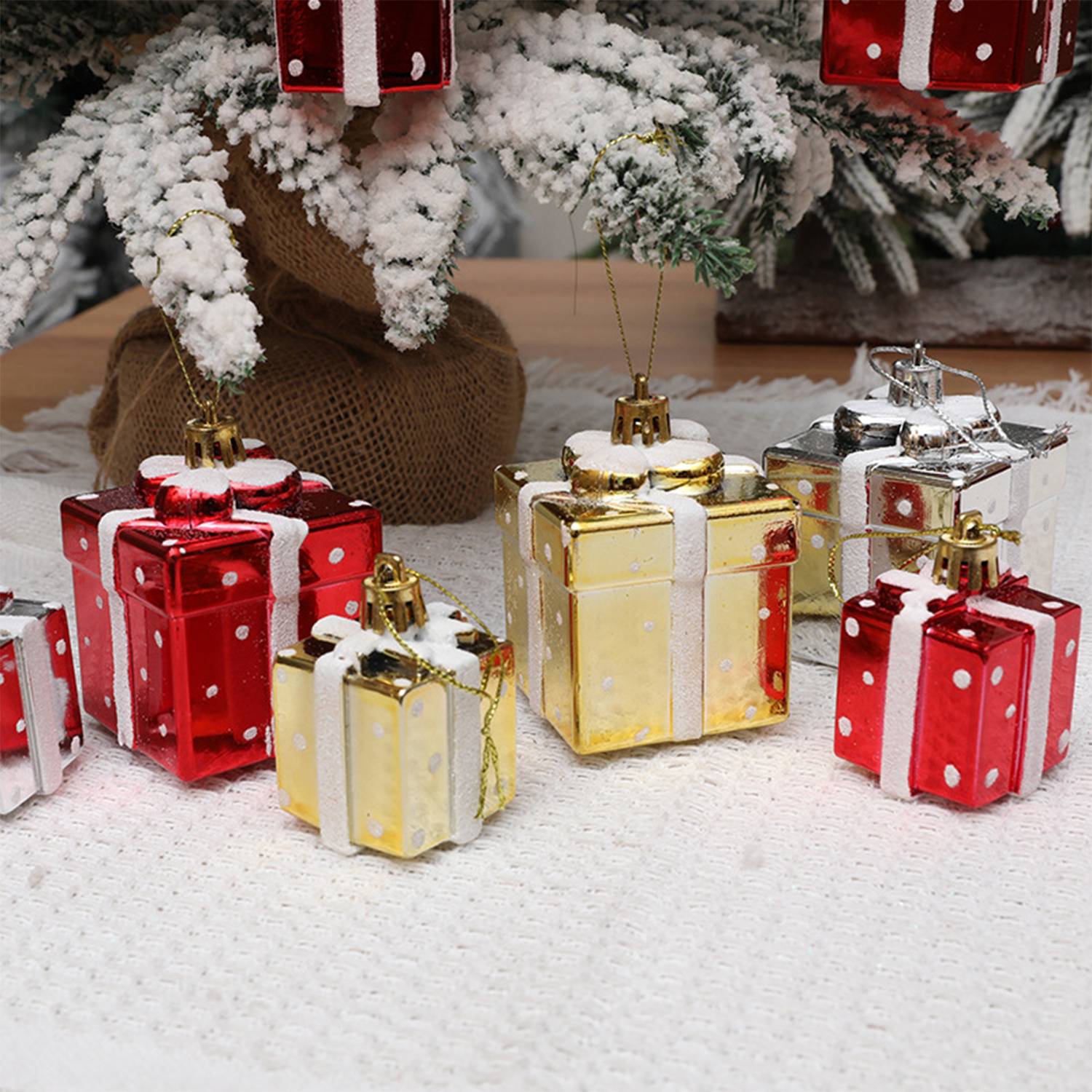 These plastic mini gift boxes provide safe, festive decoration for indoor or outdoor Christmas trees.