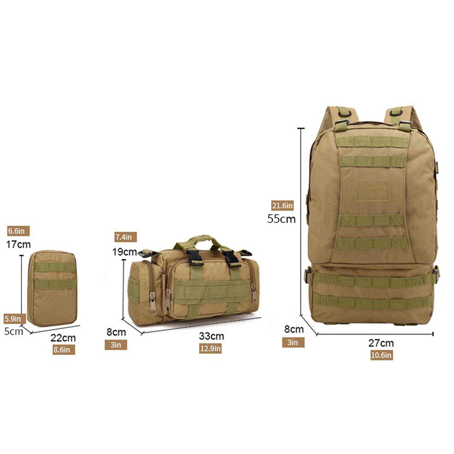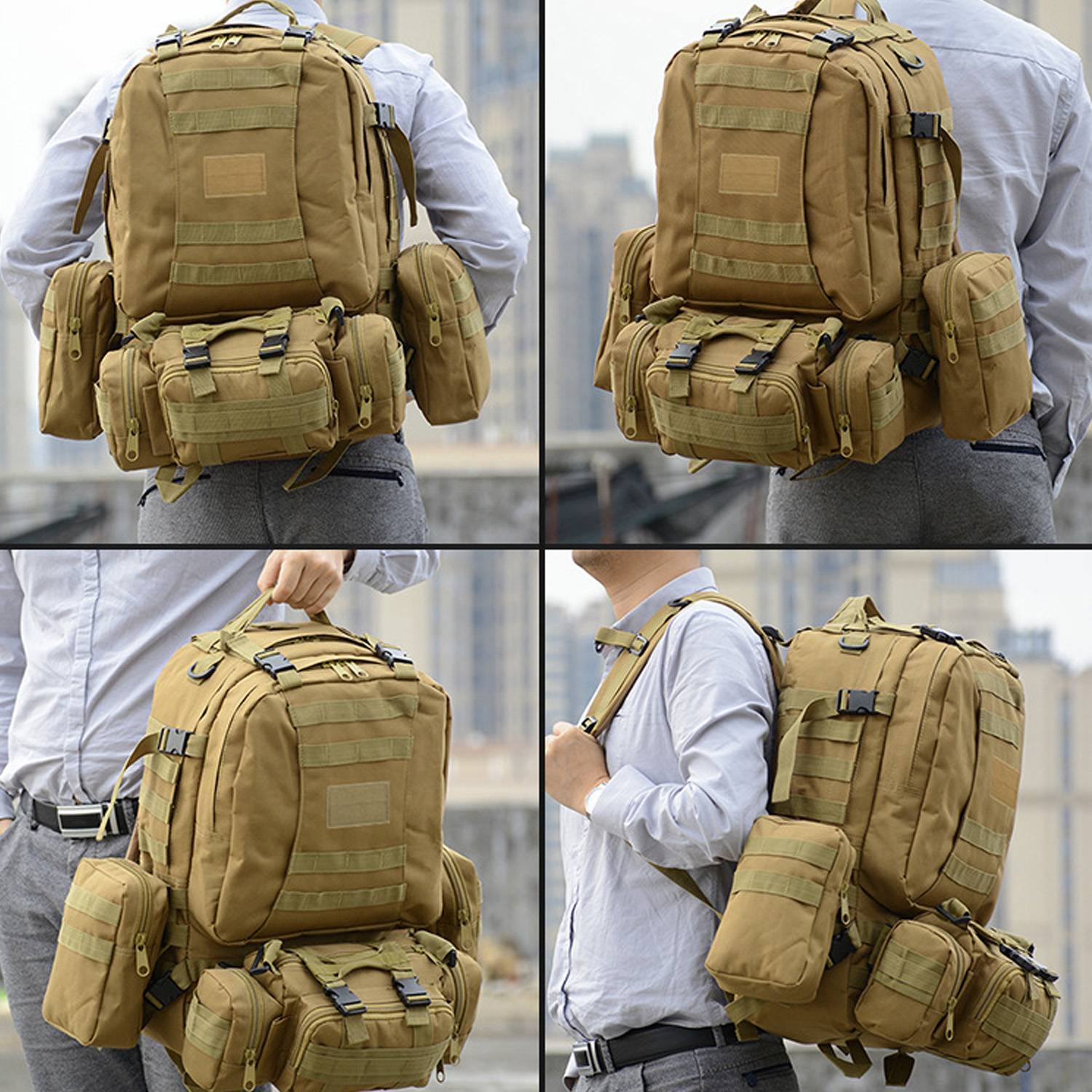 Crafted from waterproof 900D Oxford fabric, our backpack boasts exceptional tear and wear resistance. The exterior of the backpack features multiple nylon webbings, providing ample space to attach outdoor equipment as per your requirements. Furthermore, it comes with 3 detachable pouches (1 front pouch and 2 side pouches) that can be attached to the main backpack to increase storage capacity or used separately as waist bag and shoulder bag with adjustable sling strap. Featuring an ergonomic suspension system, the back and shoulder straps are designed with breathable honeycomb mesh and sponge to offer air-permeability, load dispersion, heat insulation, shock absorption, anti-slip and moisture-proof properties.