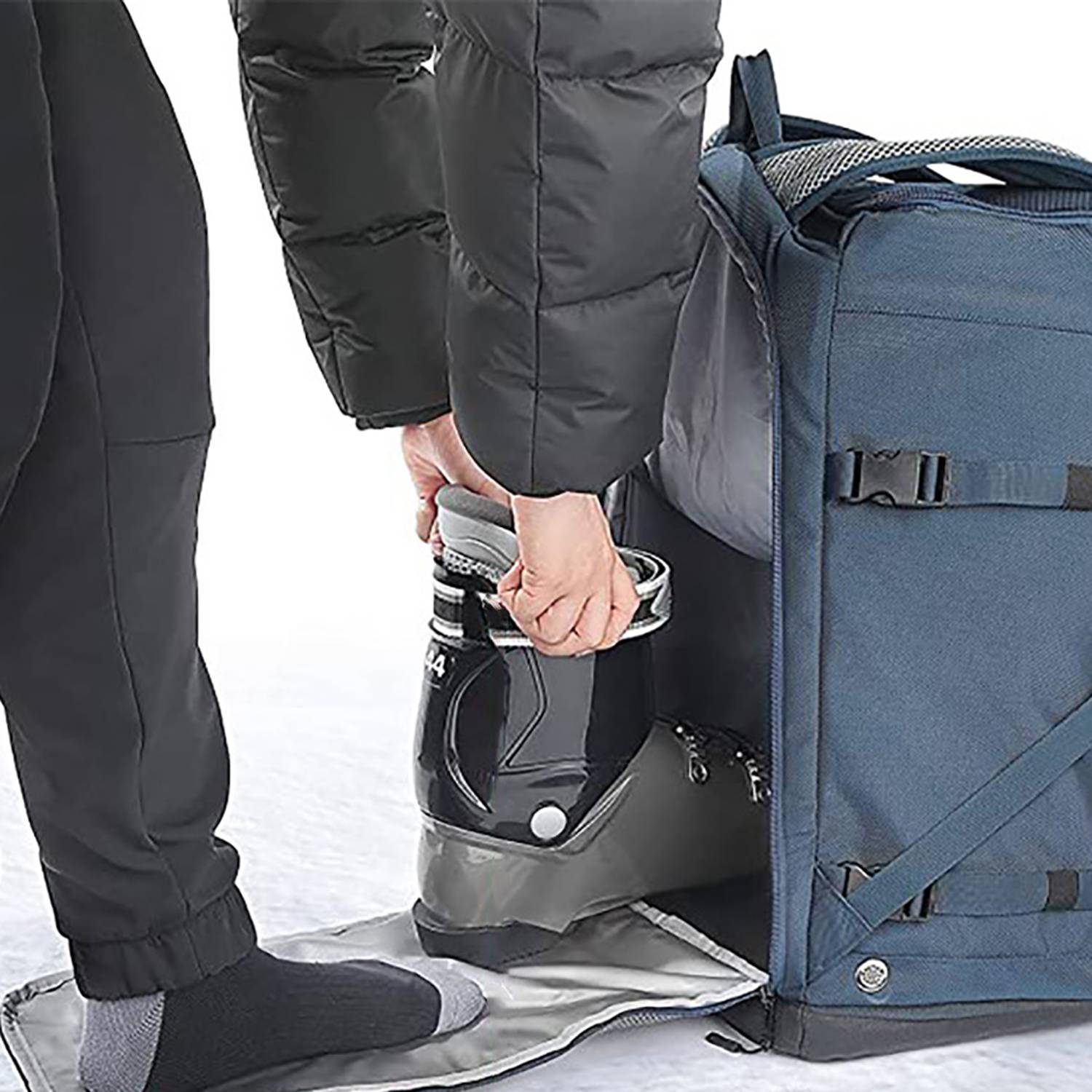 Custom large waterproof ski backpack with extra pockets, foldable mat, nylon material, protects gear, perfect for skiing .