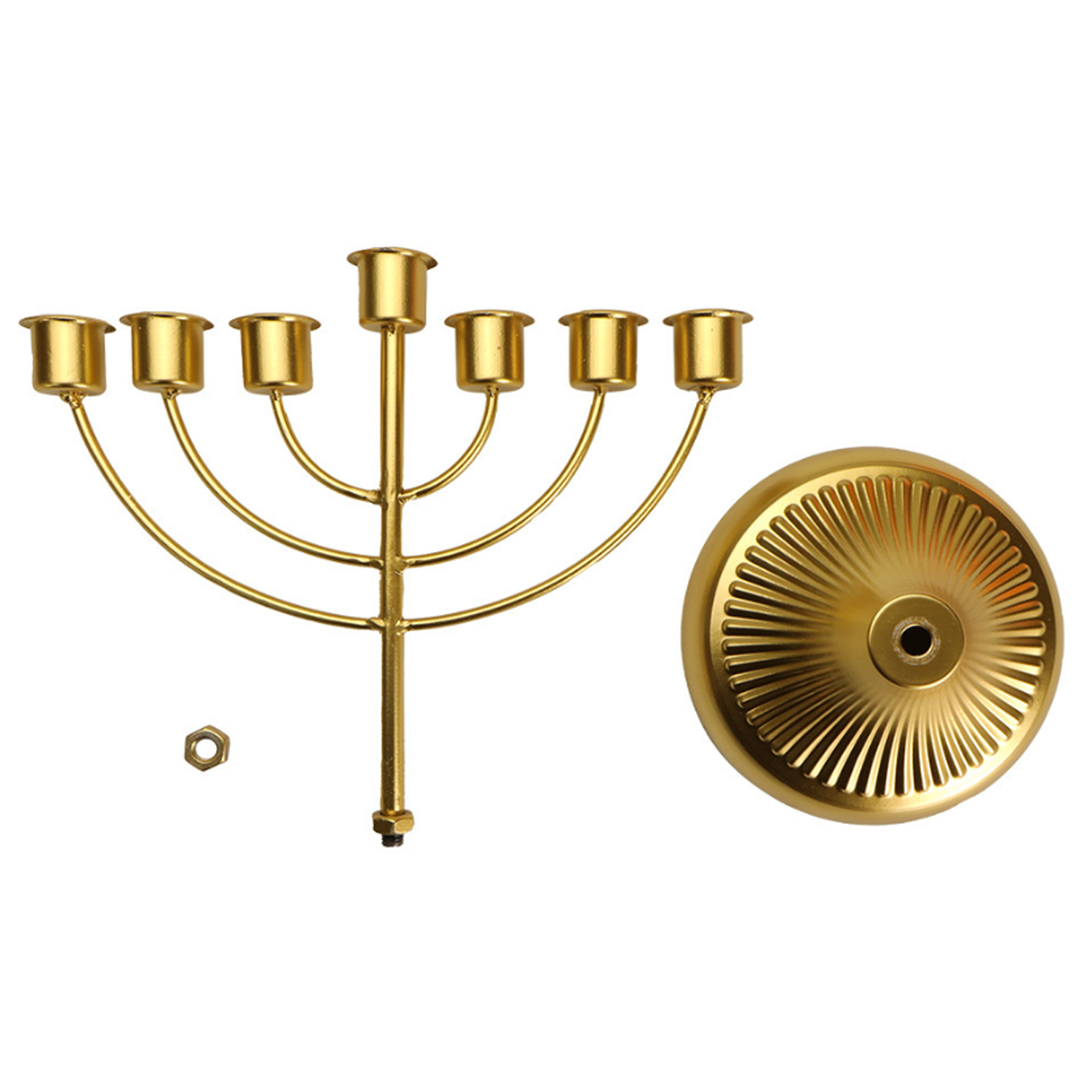 This Hanukkah menorah features seven branches for holding candles, constructed from durable iron with a gold spray paint. The design is practical, divided into two sections that assemble quickly using included bolts and nuts. A circular base provides enhanced stability, reducing the risk of tipping during use. Made with ironwork techniques, this piece serves as a functional centerpiece for Hanukkah celebrations, suitable for home rituals. The bolted connection ensures a secure fit.