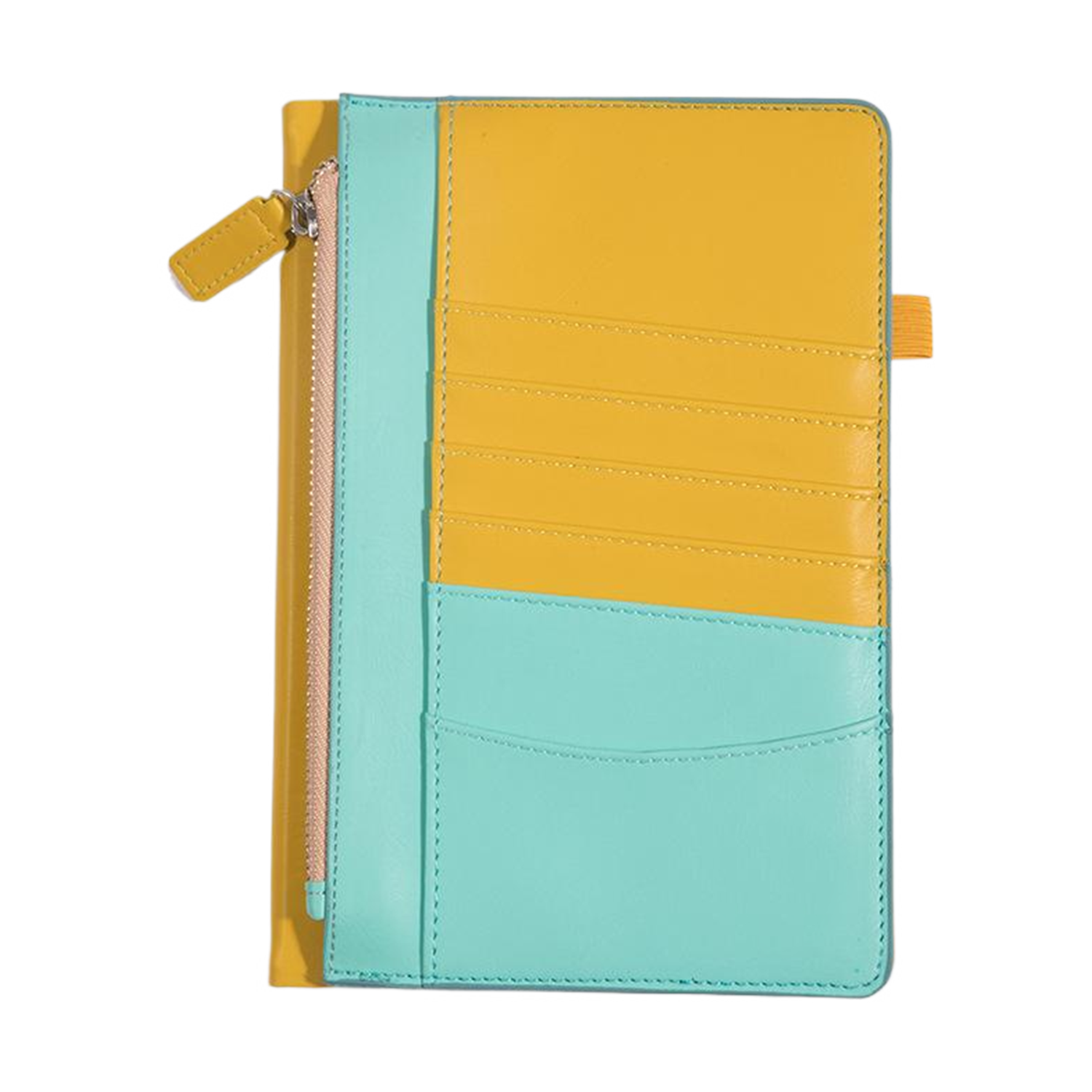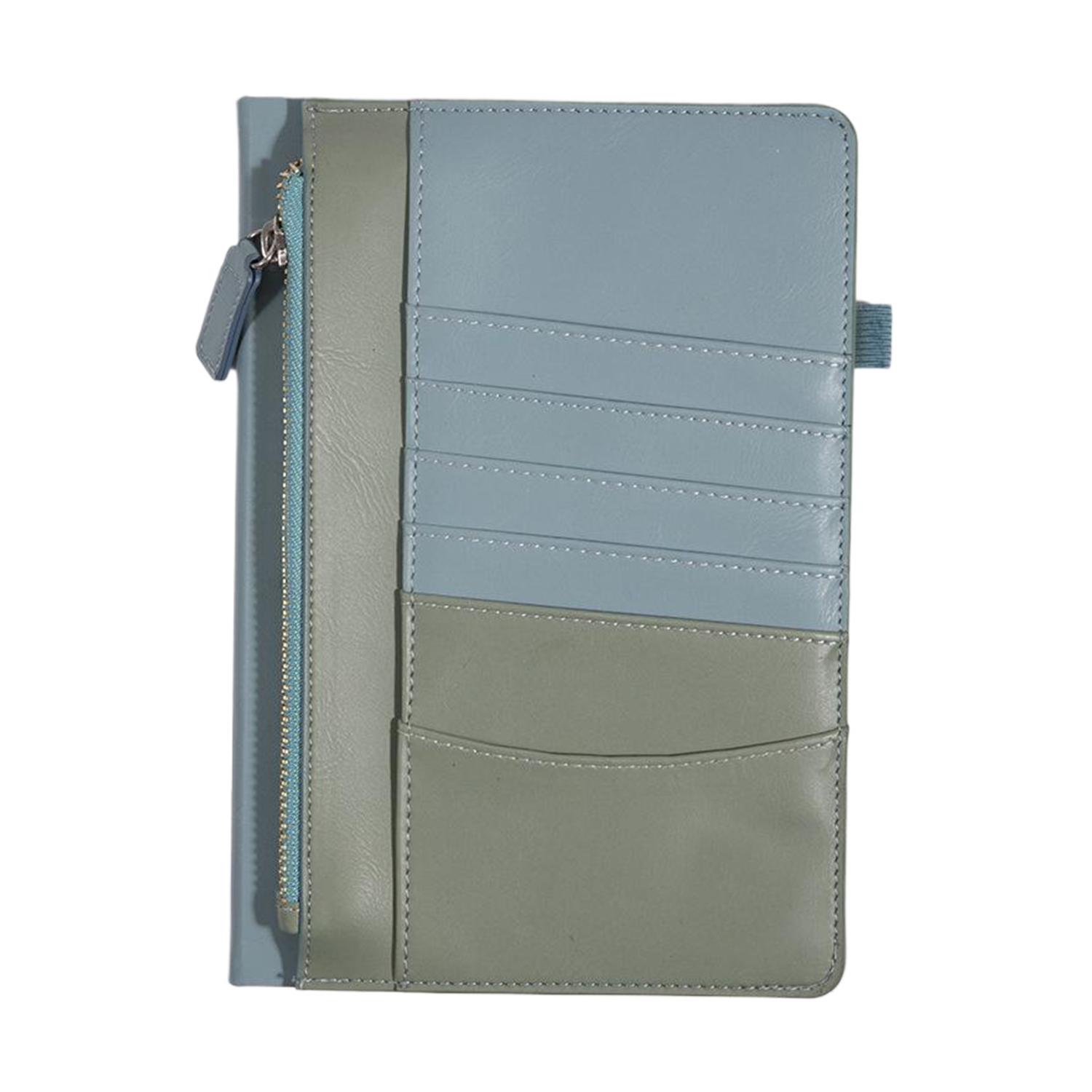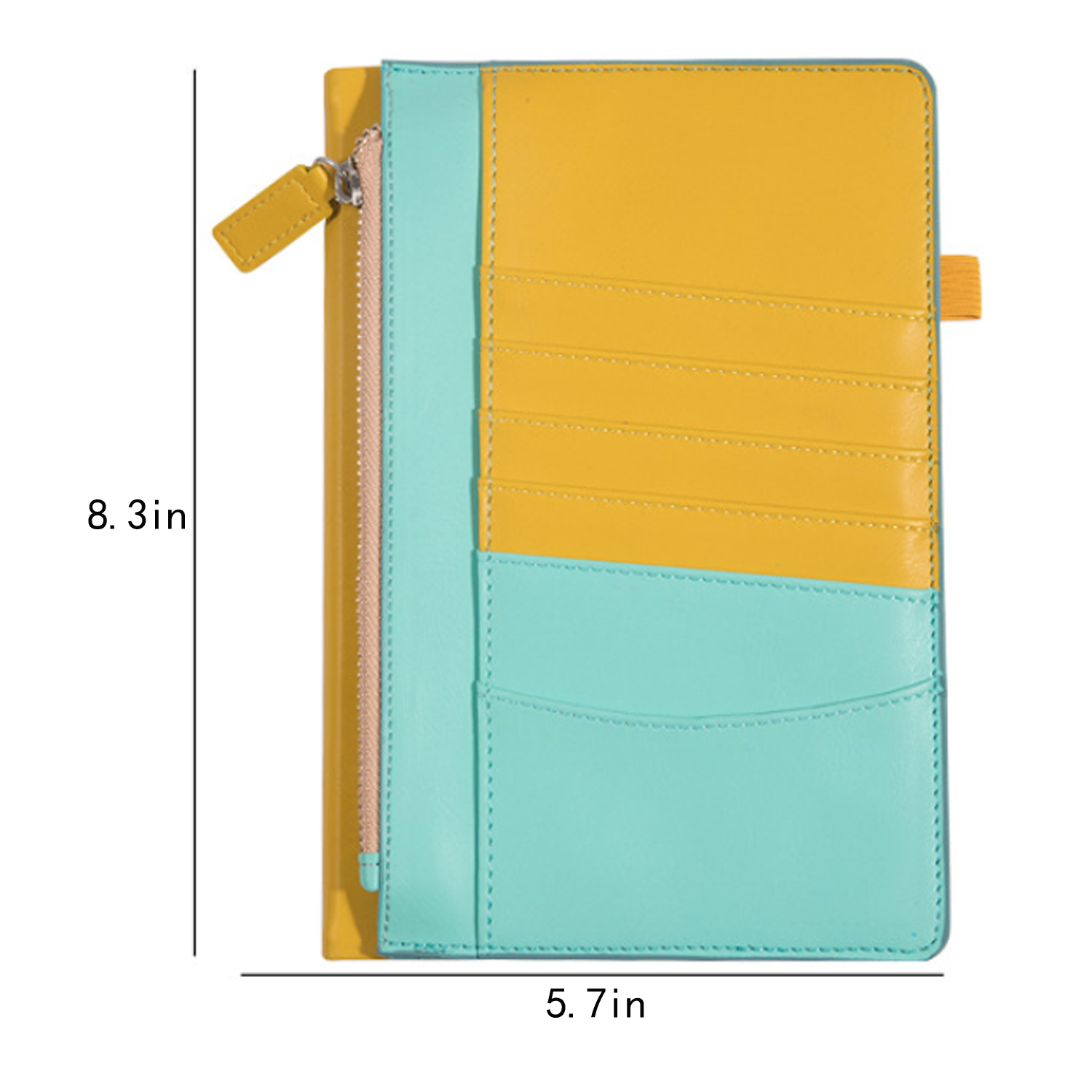 This A5 notebook set functions as an all-in-one organizational tool. The cover is made from PU leather featuring a two-tone color block design. The cover pouch of the notebook can be removed and is attached to the notebook with a magnet. A full-length zipper closure secures the contents inside. The front cover includes multiple card slots for bank cards or business cards. A convenient pen loop is situated on the side. 110 sheets of thick, quality paper suitable. A ribbon bookmark helps keep your place.