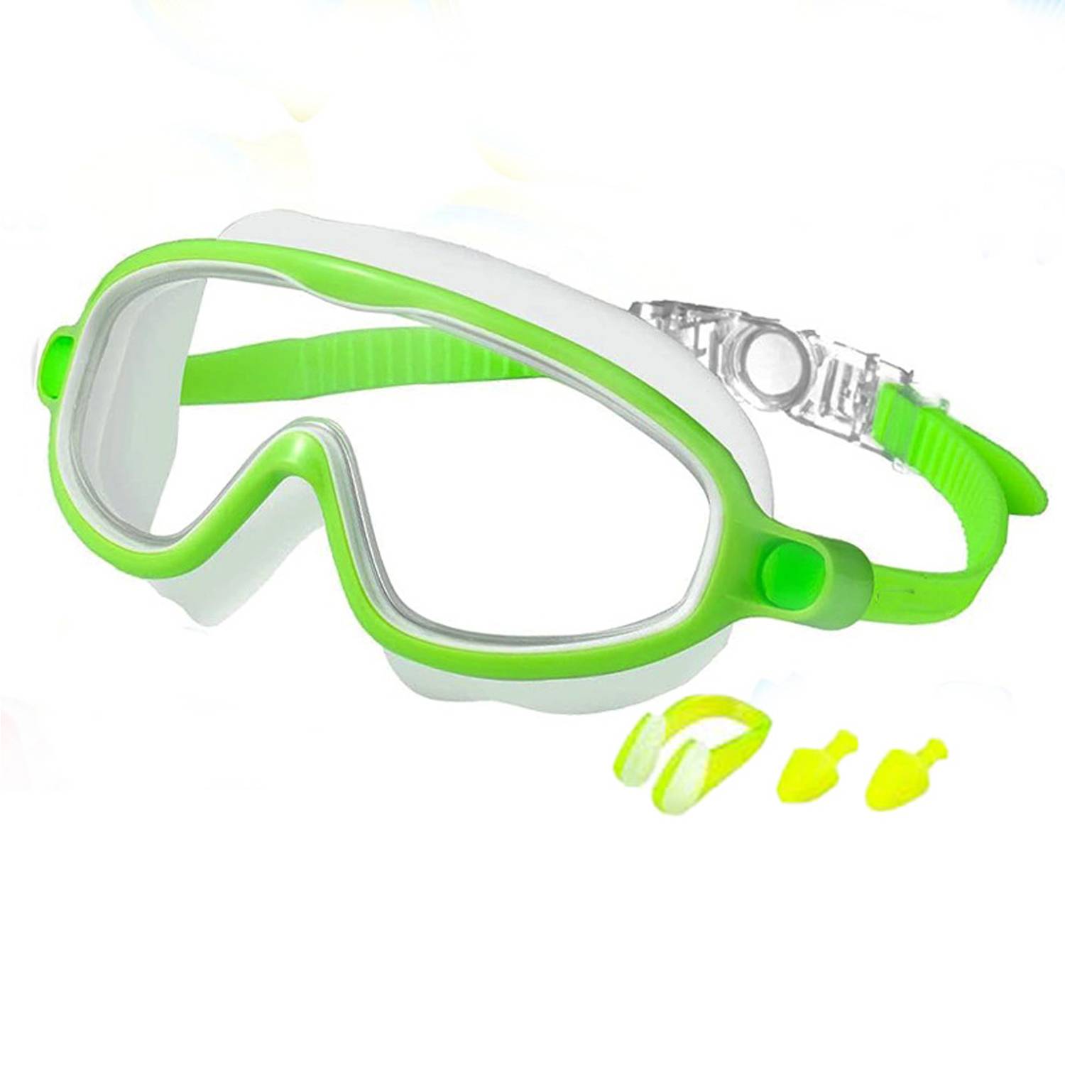 Kids swim goggles with anti-fog UV lenses, soft leakproof silicone seal, adjustable straps for secure fit, comfortable for pool.