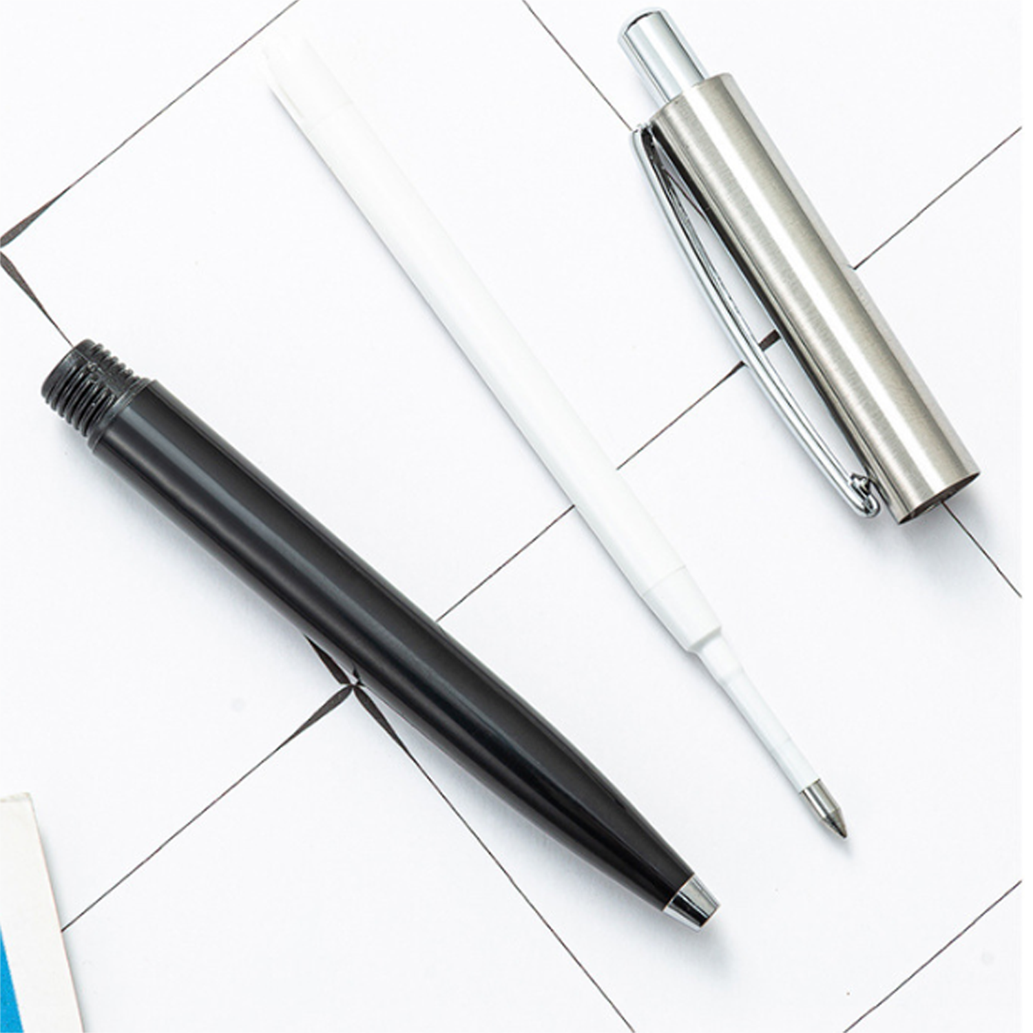 A retractable ballpoint pen with an aluminum upper barrel, plastic lower section, and metal clip. Offers writing for office.