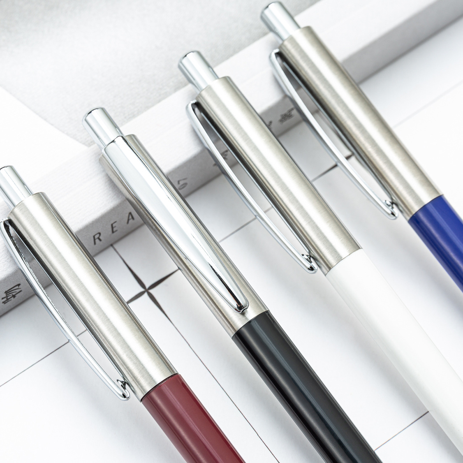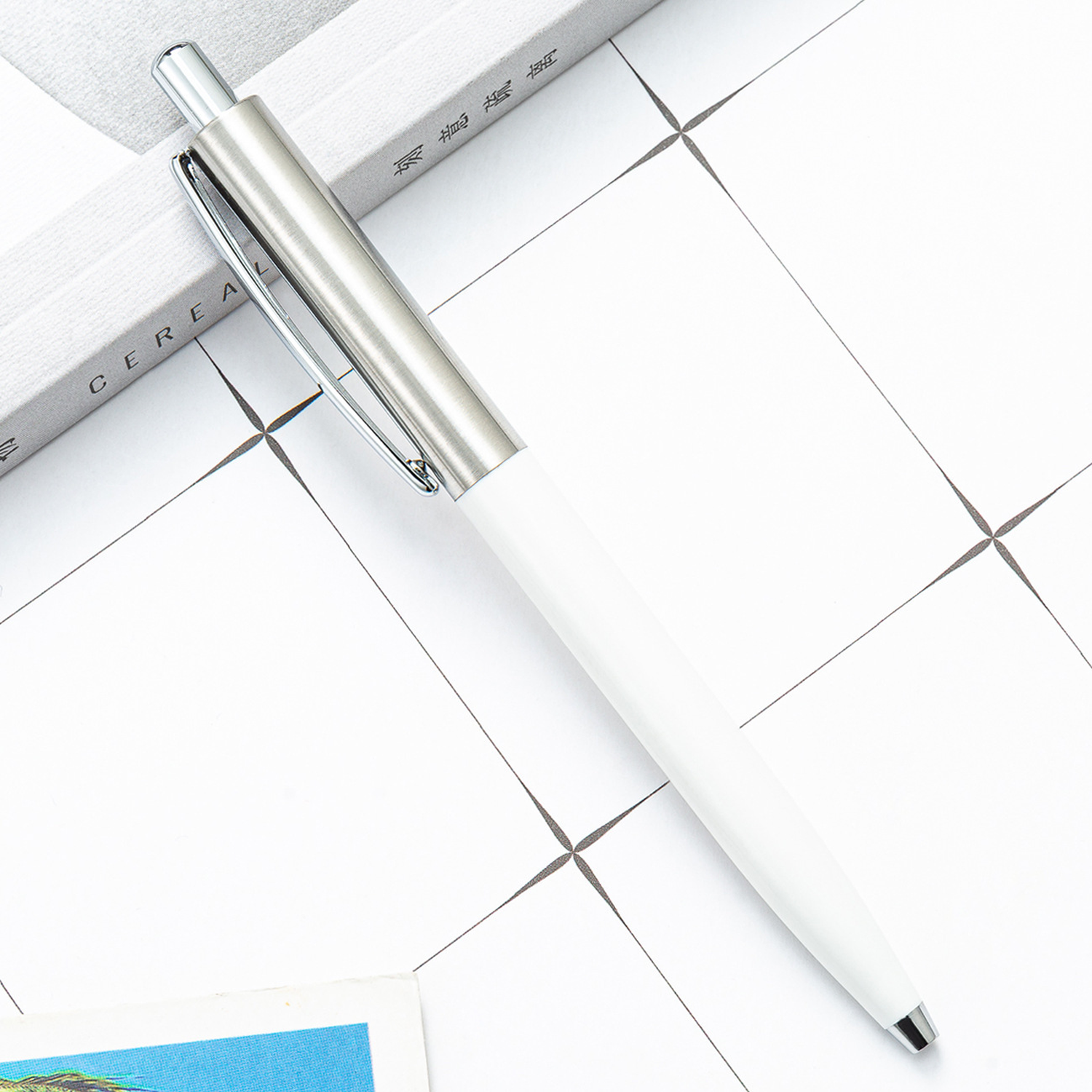 This retractable ballpoint pen combines aluminum and plastic in its construction. The upper section of the barrel features a silver metal finish. A functional metal clip is attached for securing the pen to a pocket or notebook. The click mechanism allows for smooth one-handed operation to extend and retract the pen tip. The combination of materials offers durability from the metal and a lightweight feel from the plastic. It is designed for writing or daily use.