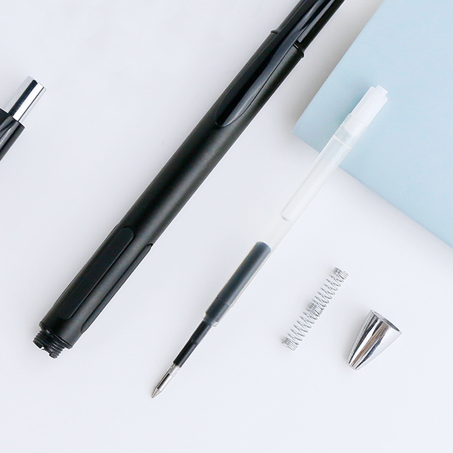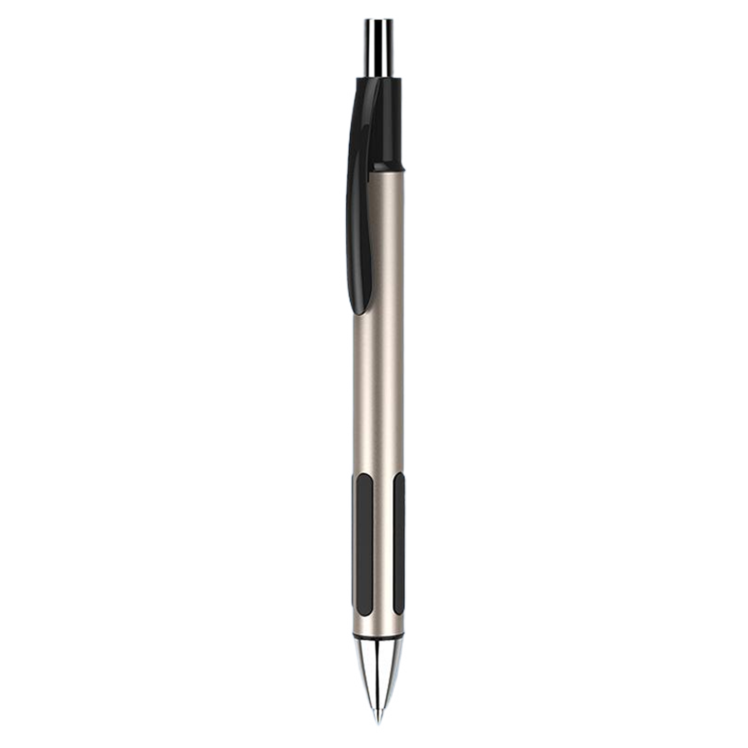 This ballpoint pen features a durable aluminum body that is both sturdy and lightweight for comfortable daily use. The click mechanism allows for smooth, one-handed operation, making it convenient for quick notes. A textured grip with vertical stripes provides control and helps prevent slipping during extended writing sessions. The integrated clip offers a secure way to attach the pen to pockets, notebooks, or bags. Its metal construction ensures general durability for everyday handling.