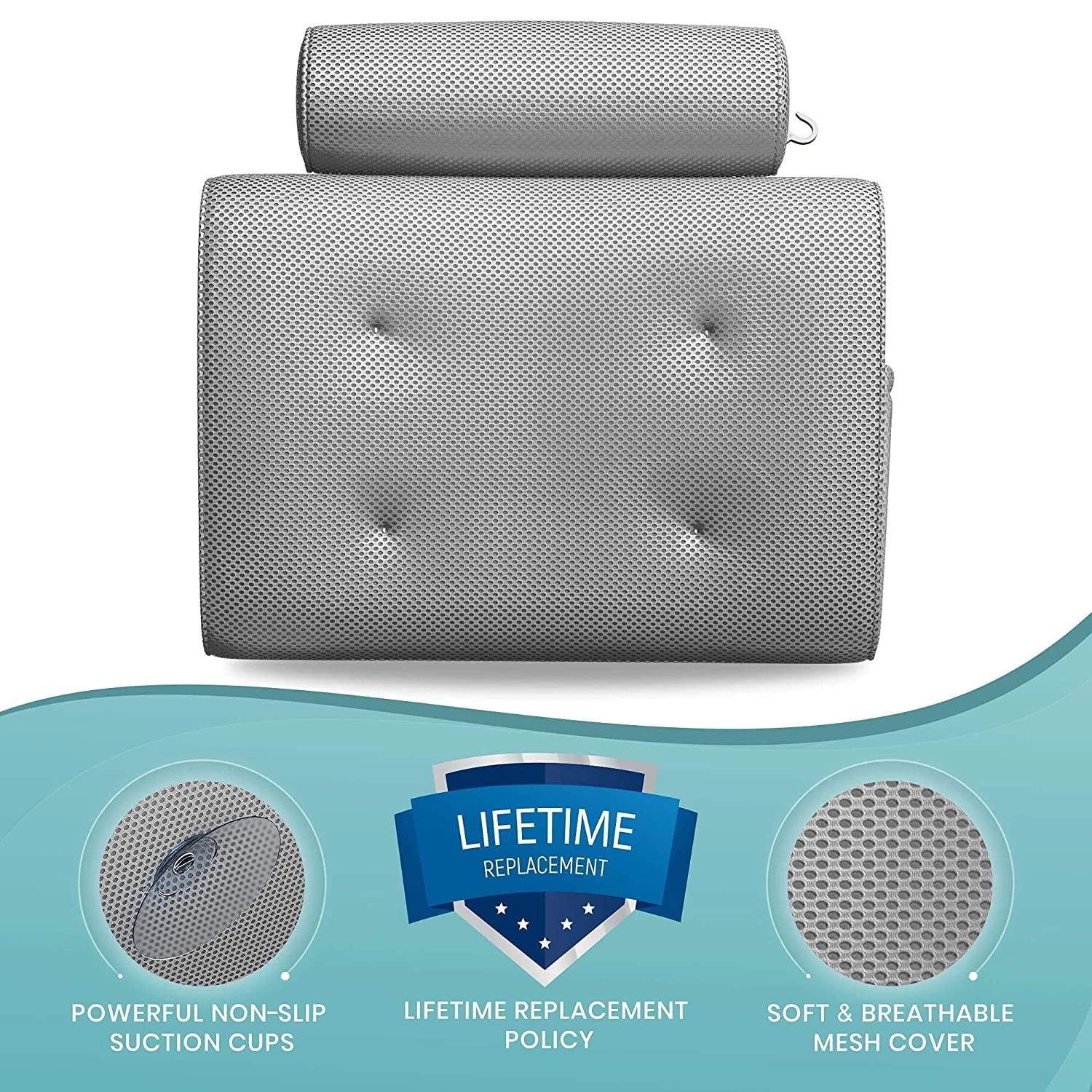 Made from soft breathable mesh fabric to allow water and air to pass through the holes easily, keeping the bathtub pillow fresh. Our premium Spa pillow is machine washable. Either wash by hand or wash in the washing machine with gentle detergent on the gentle cycle. With convenient built-in hanging hook design, the bath tub pillow can be hang on a towel rack or bathrobe hook in the bathroom after each use for fast and easy air drying to prevent the accumulation of water to keep the pillow fresh and clean. The 2 panel bathtub pillows are ergonomically designed to perfectly fit your body curve and to provide soft and powerful support for your head, neck, shoulders and back, making you fully relax after work or sports. 15 x 14 inches.