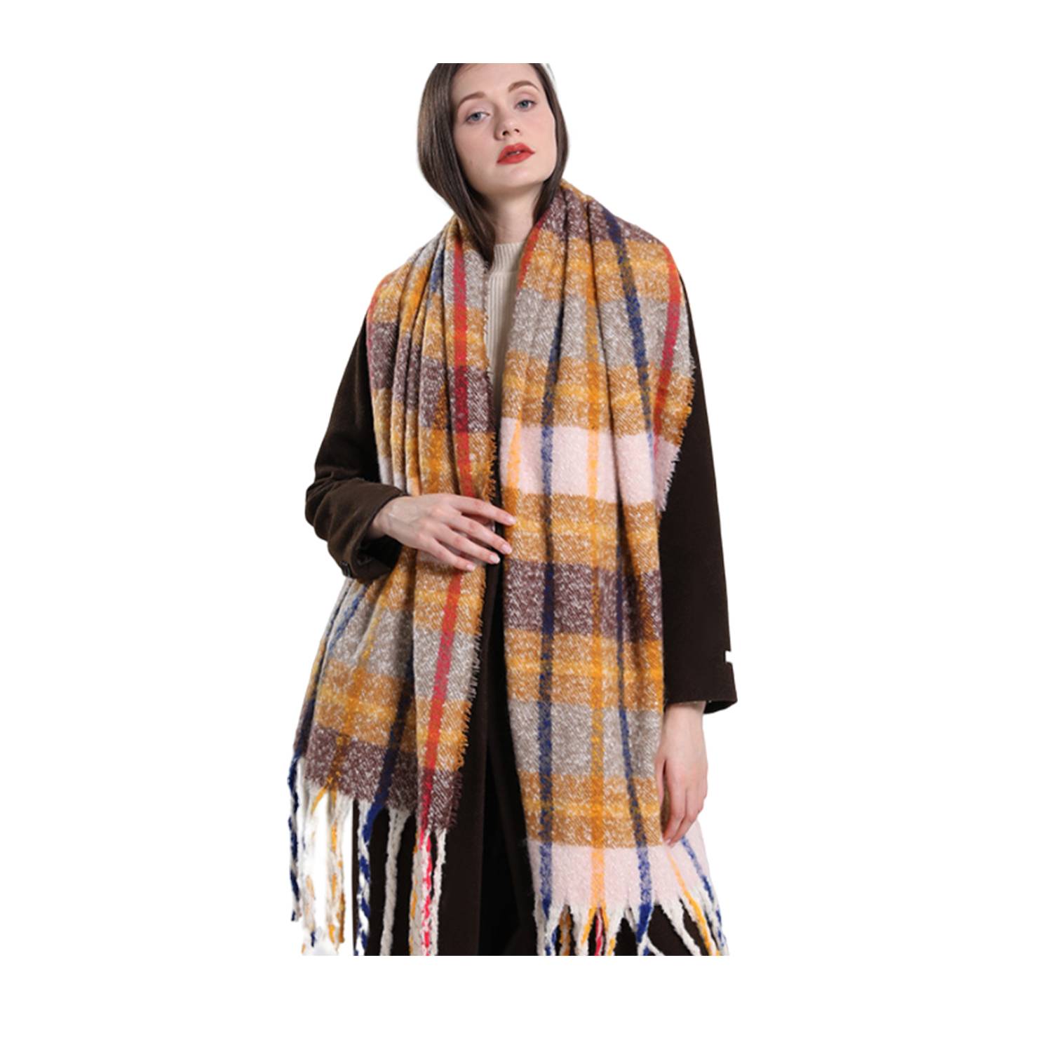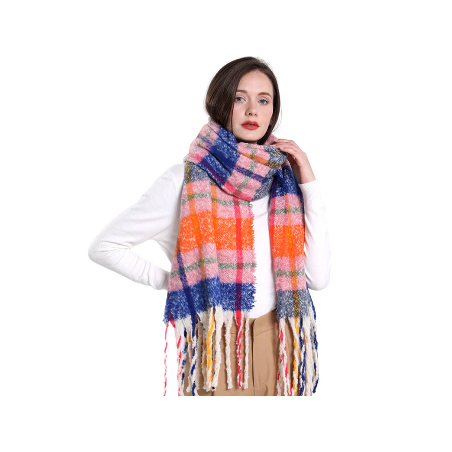 The fashionable AC Warm Rainbow-Colored Plaid Long Scarf is a luxurious and cozy accessory made from ultra-soft mohair
