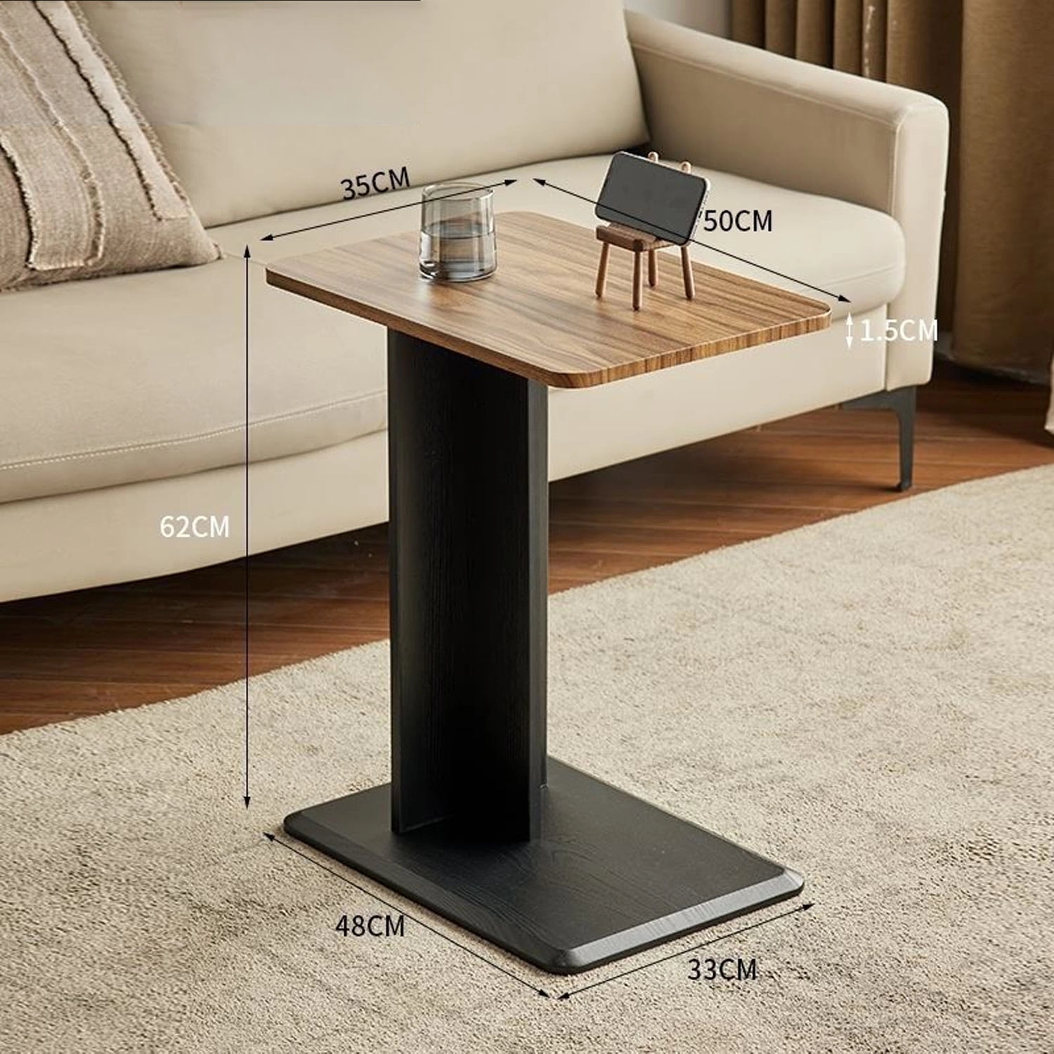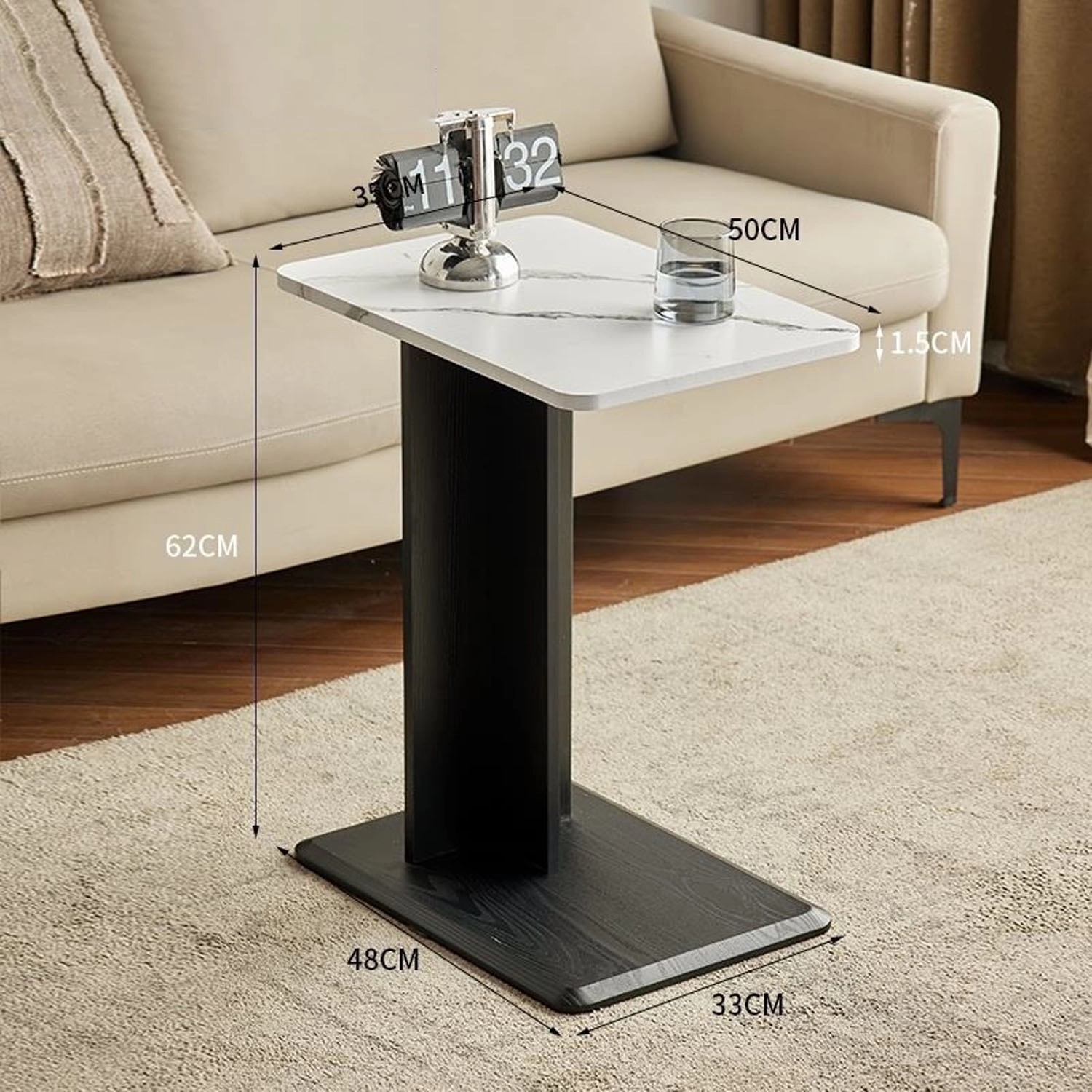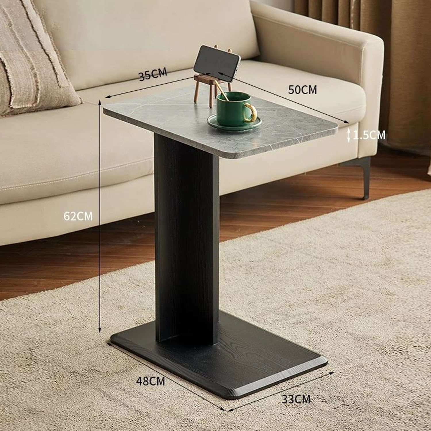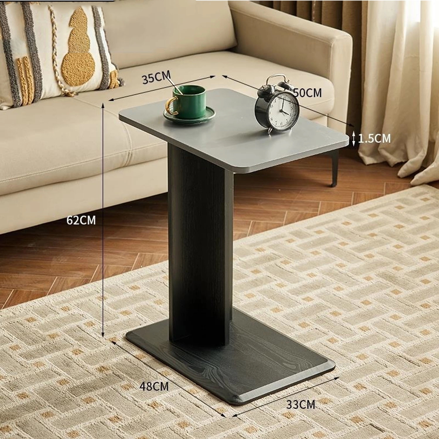 Made of Wood. C-Shaped Side Table. Hug the side of your sofa or bed with this end table, so you can enjoy the storage or workstation conveniently. Each C-shaped table boasts a large tabletop sized 19.68”L x 13.78”W and a reasonable height of 24.4″, which works wonders for a laptop, dining, or as an occasional table. This C table for couches is durable enough to serve you in the coming years. Ideal for living room, bedroom and office.