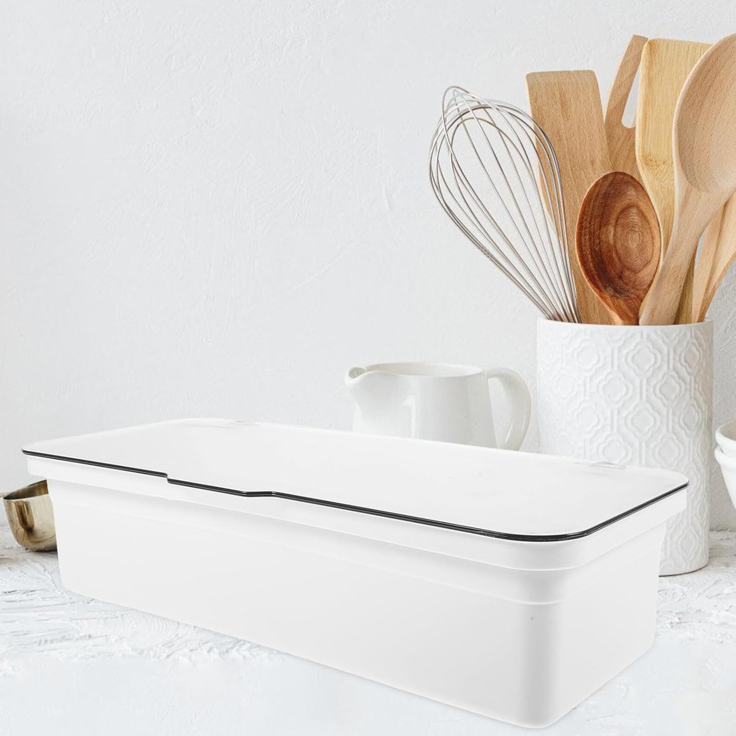 Plastic cutlery tray w/lid & drain for kitchen organization & cleanliness.