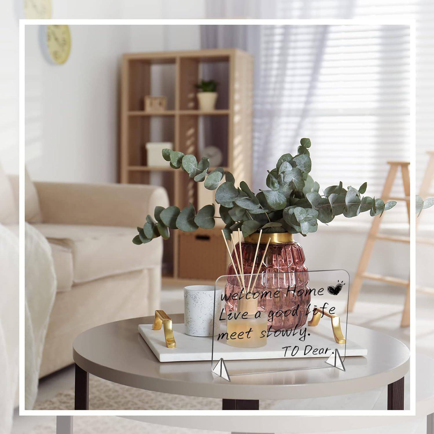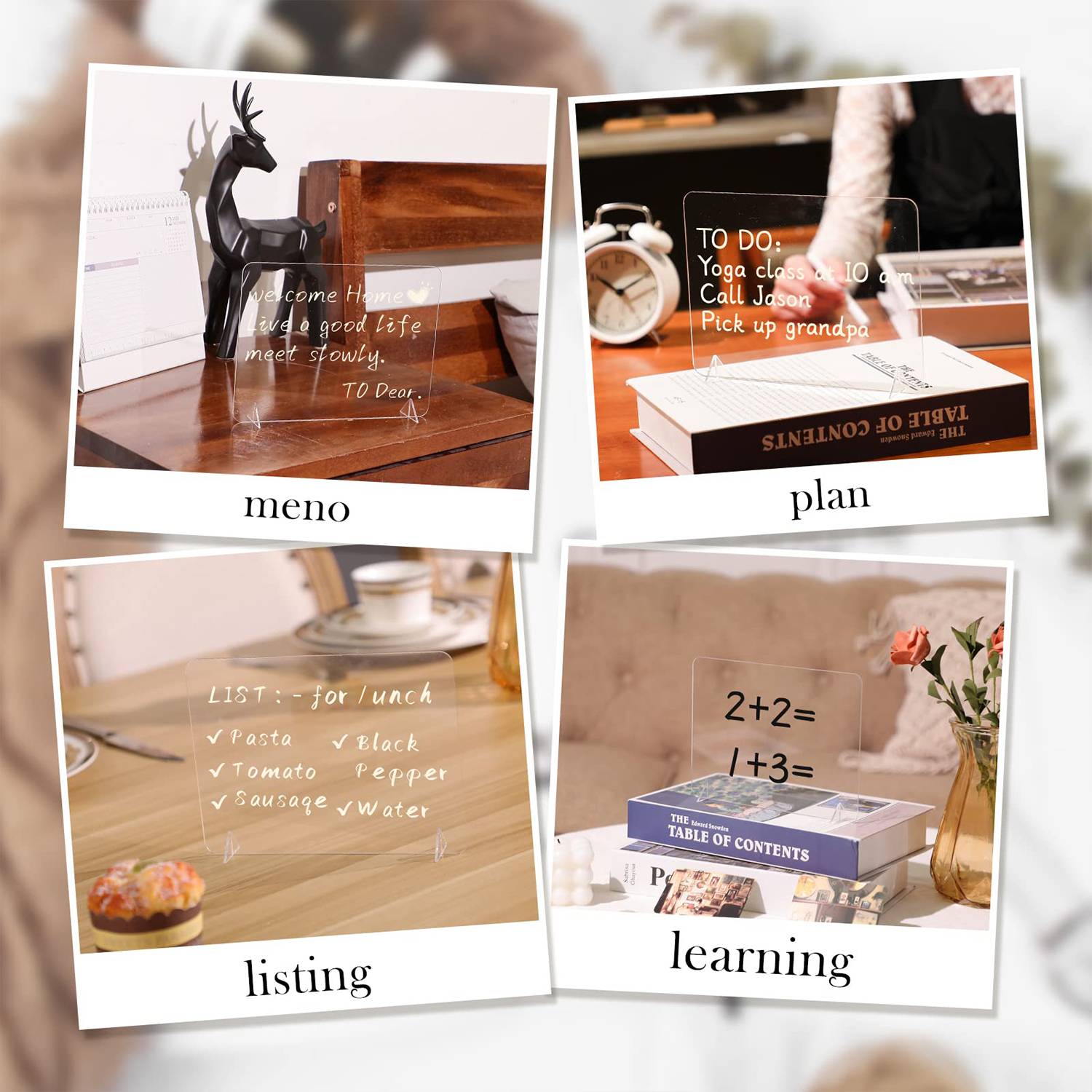 these clear whiteboard made of quality acrylic material, with a transparent and smooth appearance, the acrylic note board shows the writing content more clearly; It is easy to write with marker and wipe with wet cloth or paper;In addition, 4 corners use round corner to avoid accidental scratches in the process of use; The acrylic plate and stand can be separated, to reduce the required space in the carrying process, convenient to carry