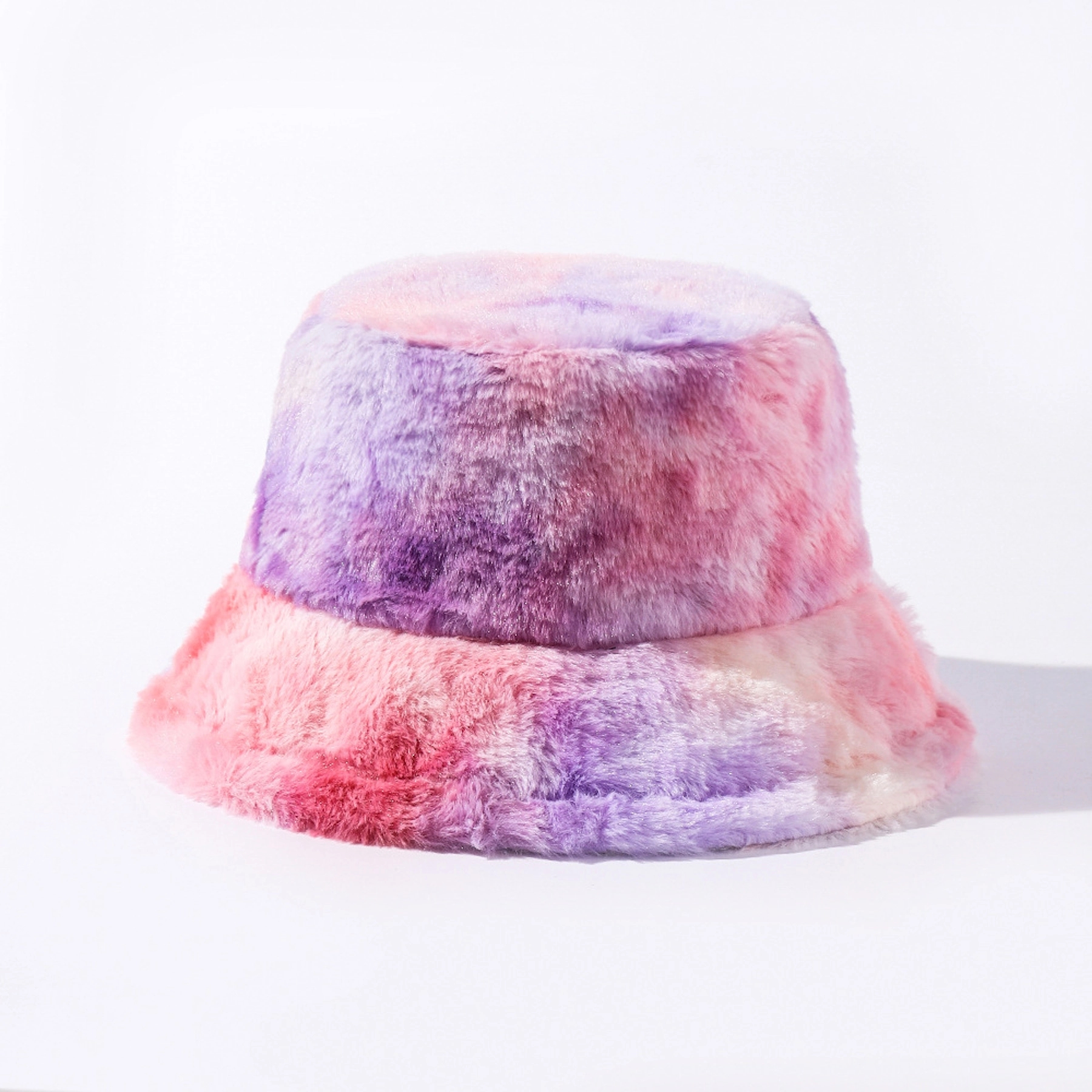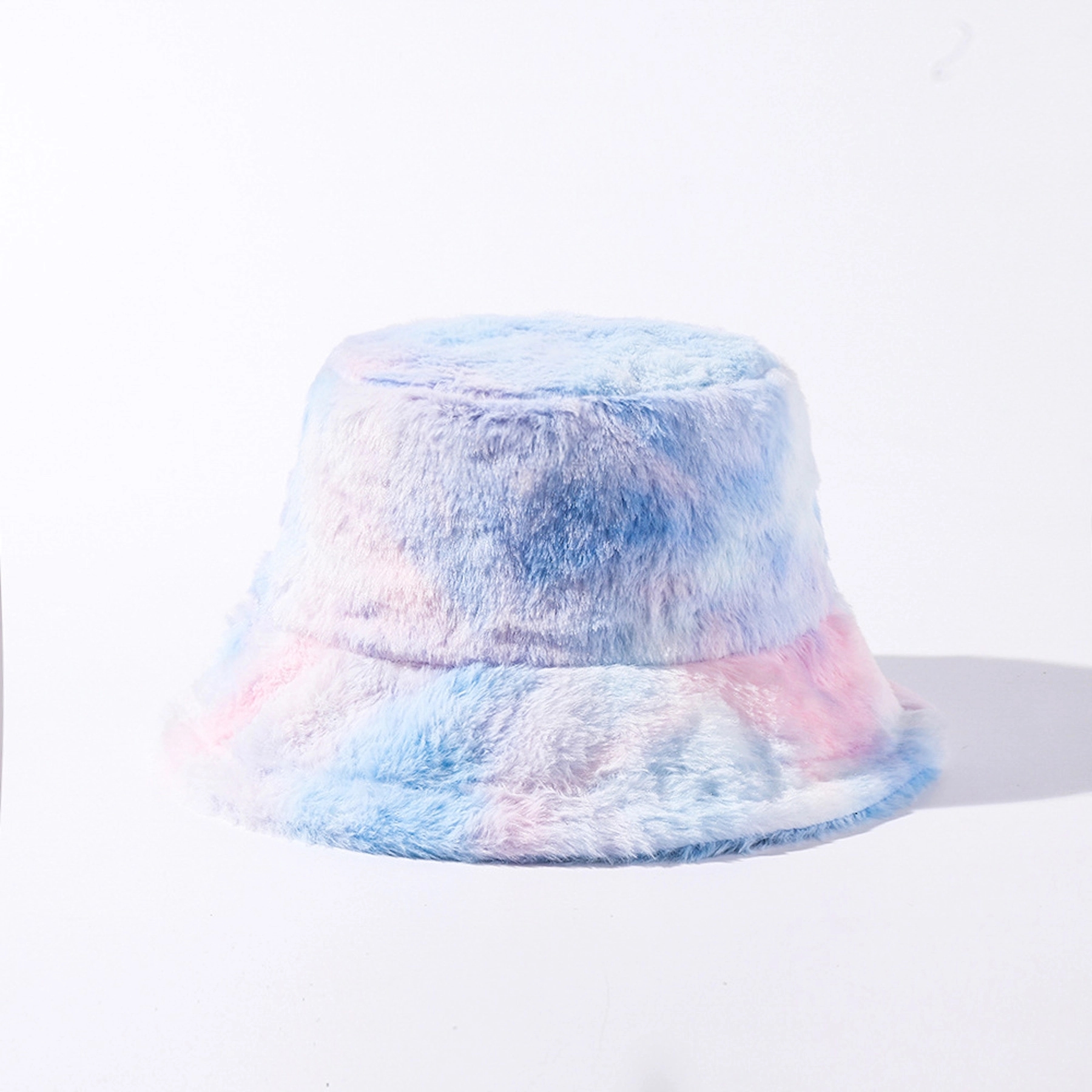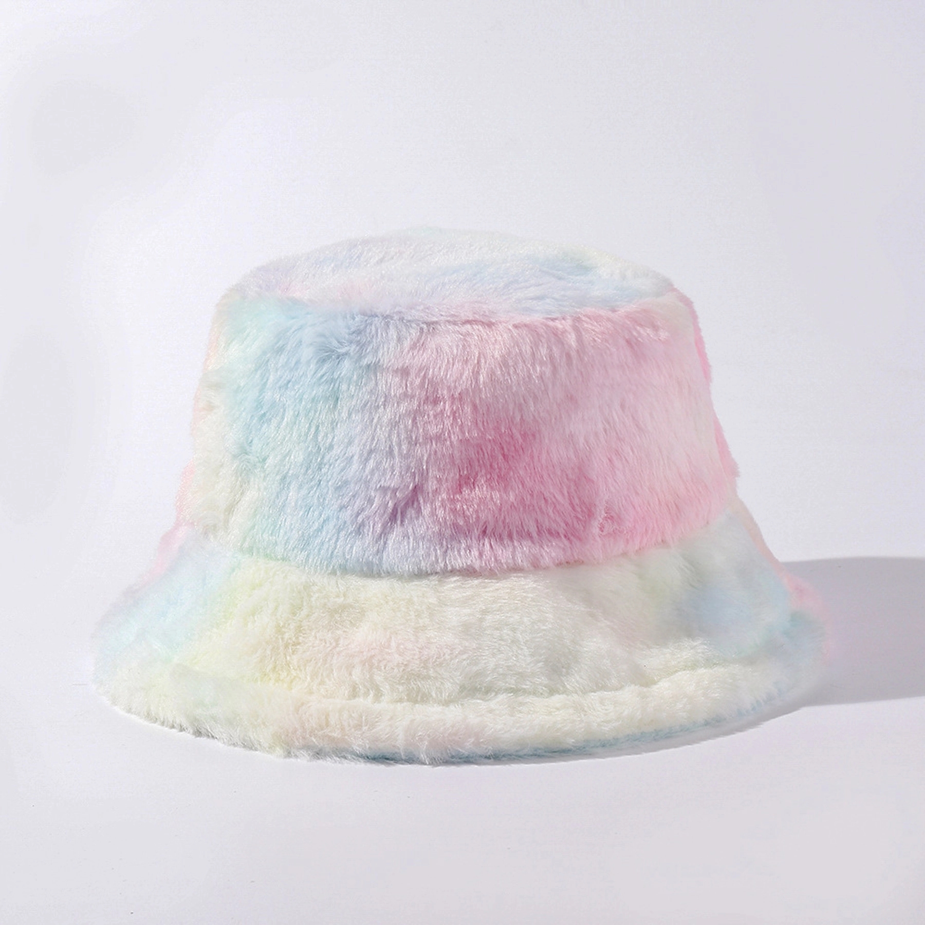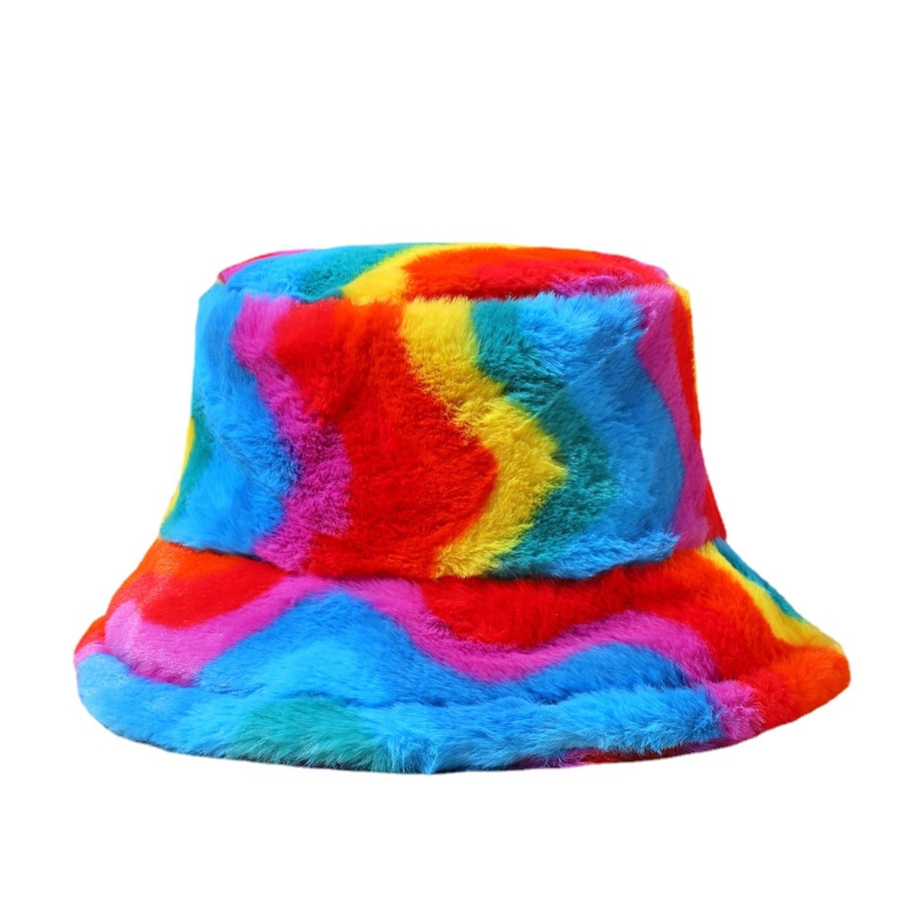 100% polyester fuzzy rainbow fur bucket hat for winter, soft and comfertable. Perfect drawstring sesign, to adjust the size for perfect match your head size, 22.8 inch circumference.