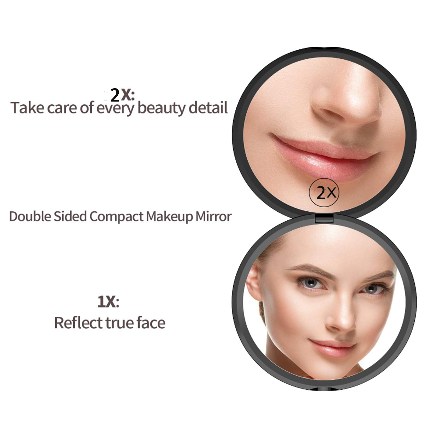 The travel makeup mirror is 0.4in thick, weighing 62g, making it portable for any occasion. It fits in makeup bags, purses, and more. With 1X/2X double-sided magnification, it caters to different makeup needs. The regular side shows the full face, while the magnifying side aids in detail touch-ups. The mirror opens 180 degrees for easy use. An elegant gift for ladies, suitable for special occasions like Christmas, Valentine’s Day, birthdays, and anniversaries.