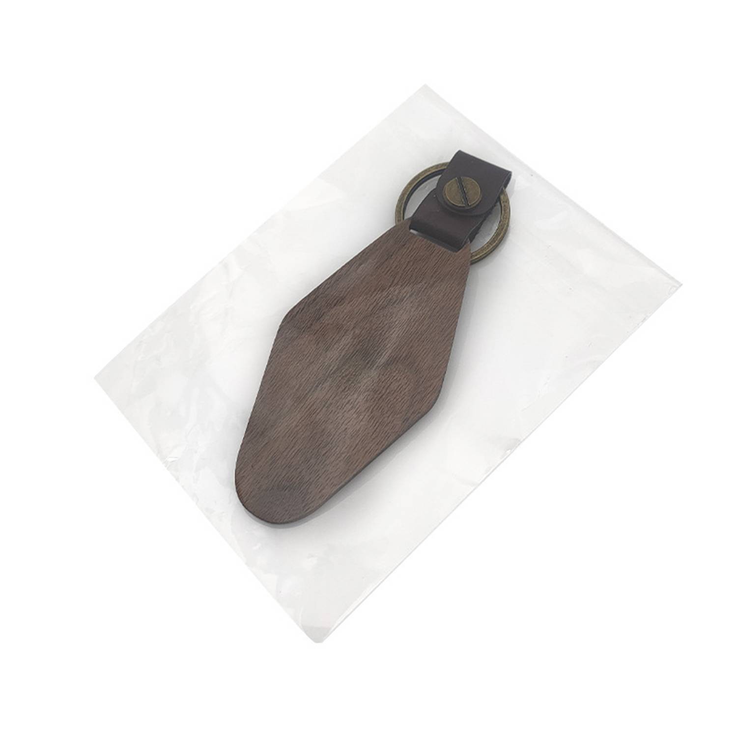Carved wood keychain blanks made of walnut wood, with semi-lustering surface, leather leather and stainless steel key ring.